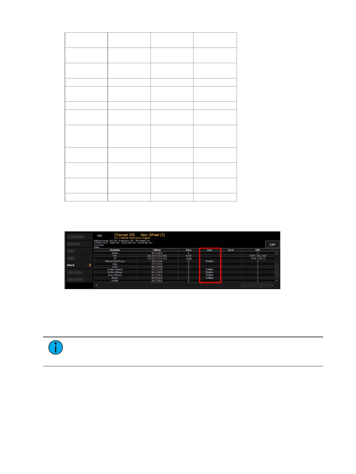 In the [About] channel patch screen, the snap column shows which parameters for that