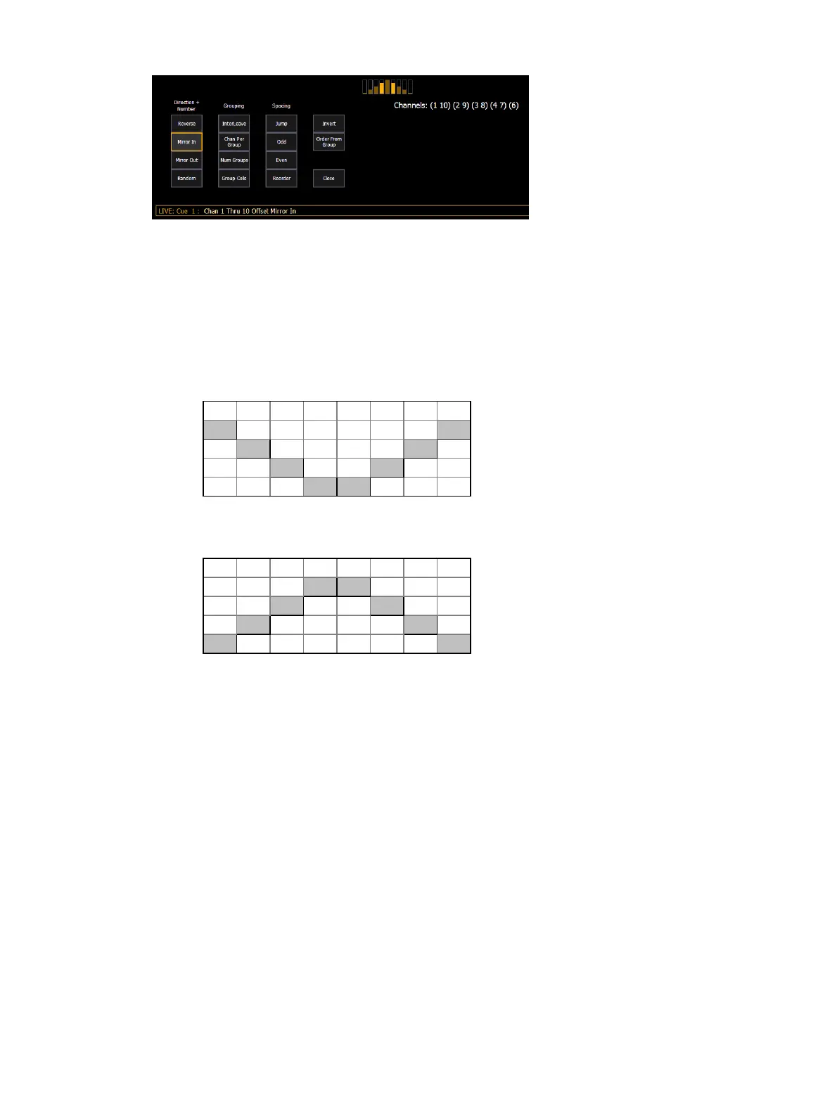 {Mirror Out} creates subgroups of channels that mirror outward.