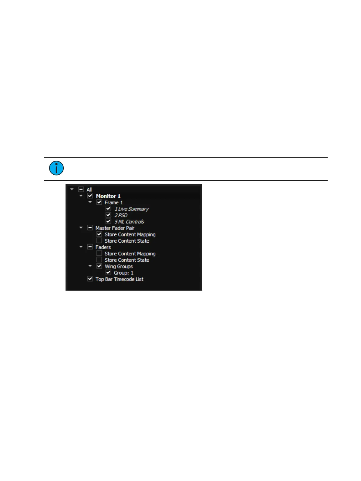 Faders - captures the current content or state of the faders including: fader page