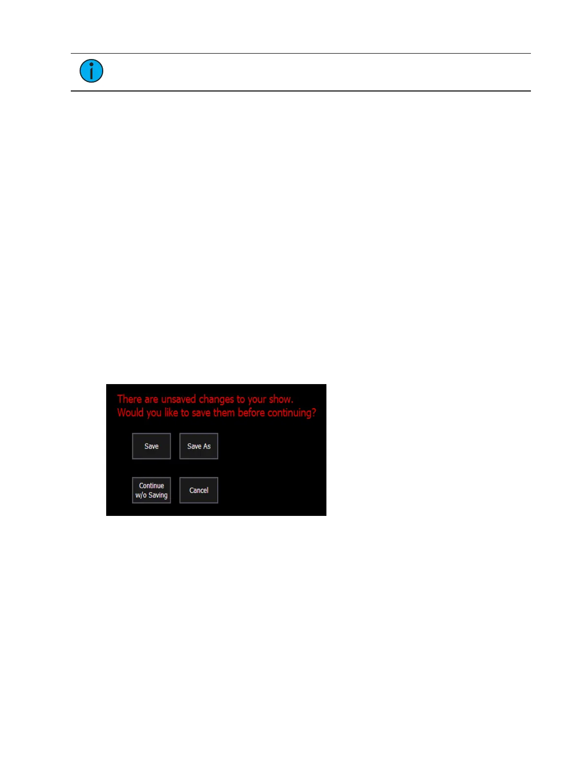 If there is unsaved data in the current show file, a save warning will display when you attempt