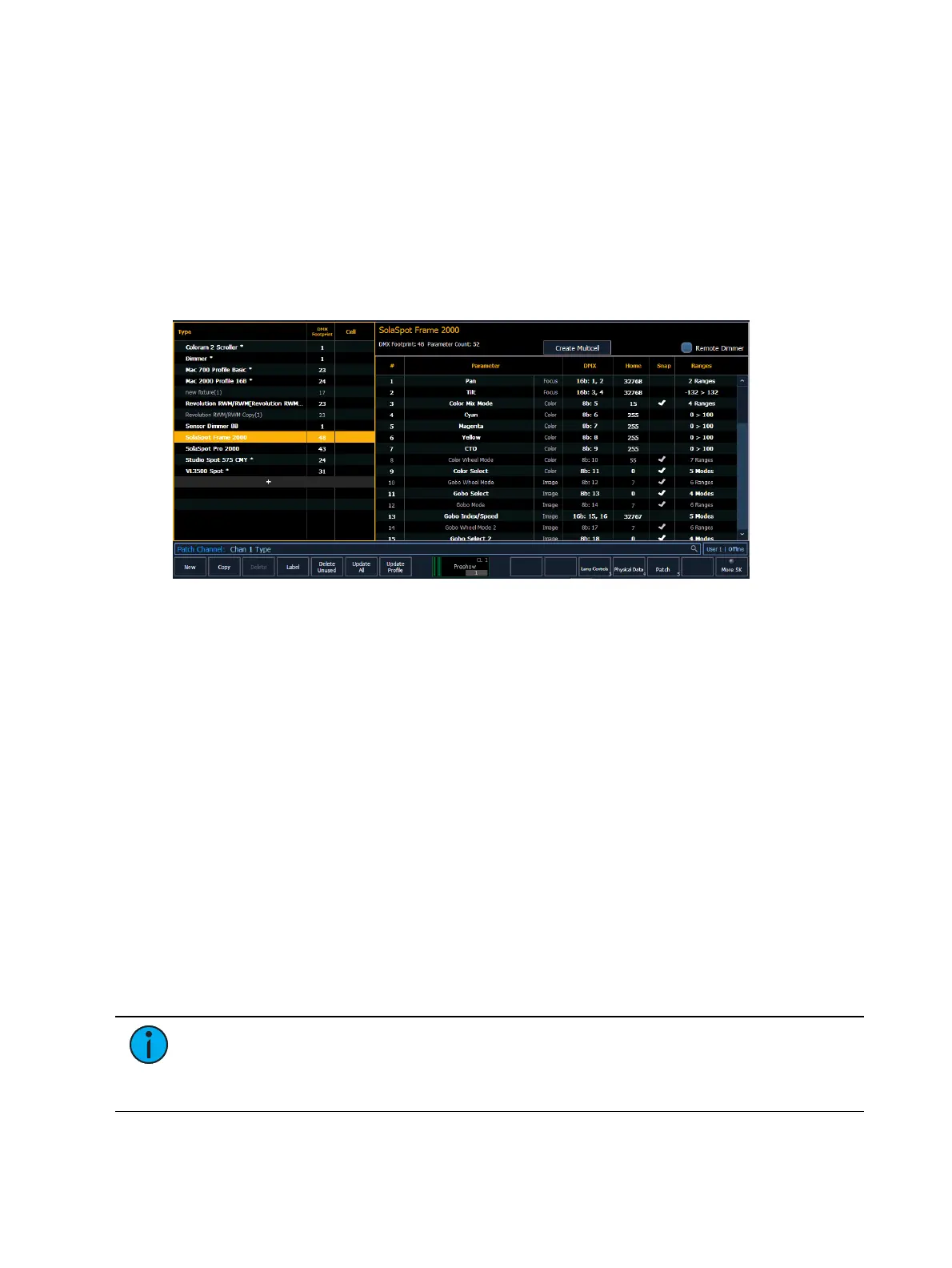 that are currently patched or have been added to the show, and the list on the right are