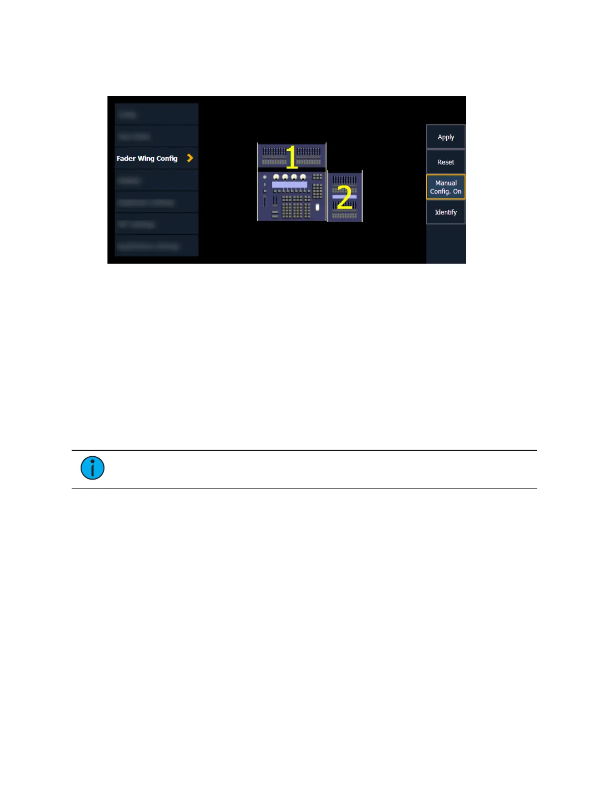 All configuration and navigation settings are applied to any fader wings or banks included in a