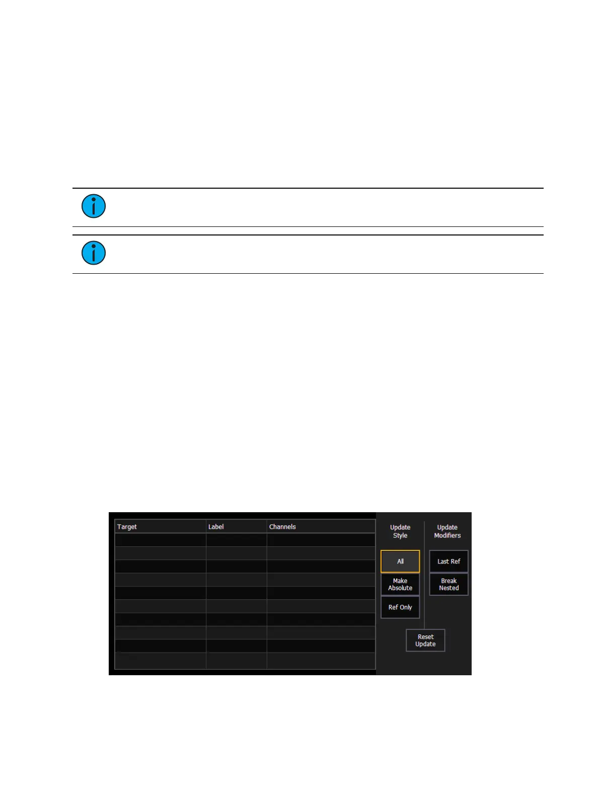 {All} - this button will update the target cue and all references stored to that cue (nested