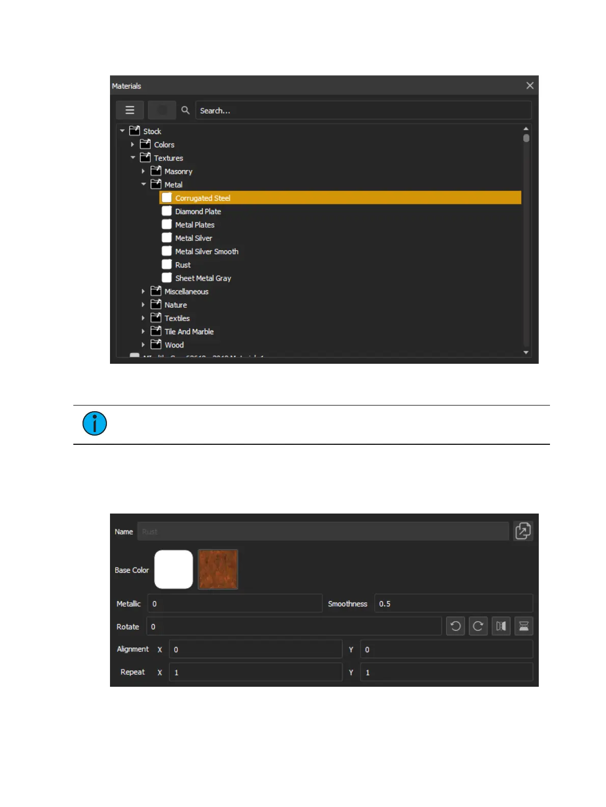 Selecting a material in the library will display the following options: