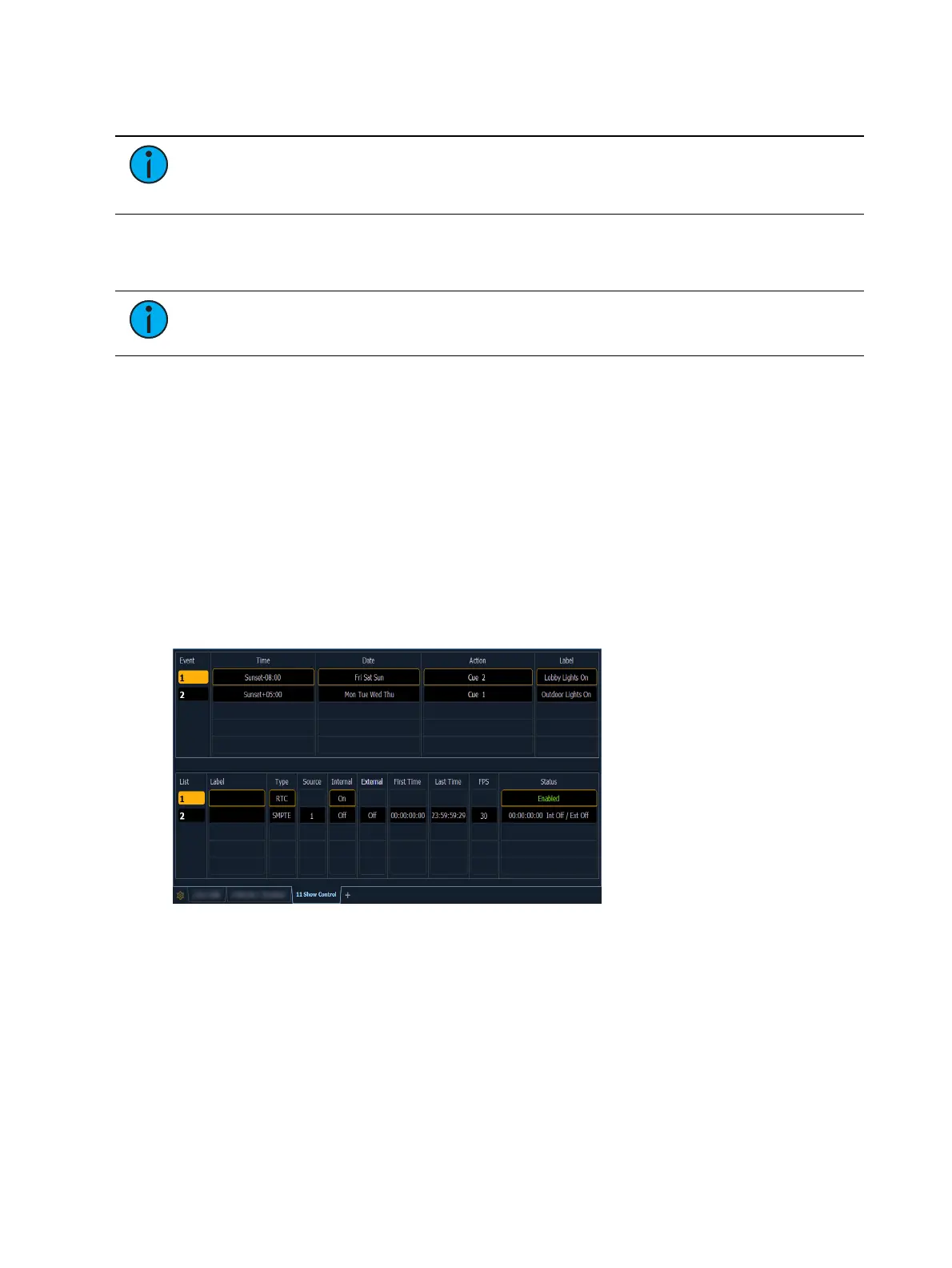 The lower portion of the show control display contains the event lists used in the console.