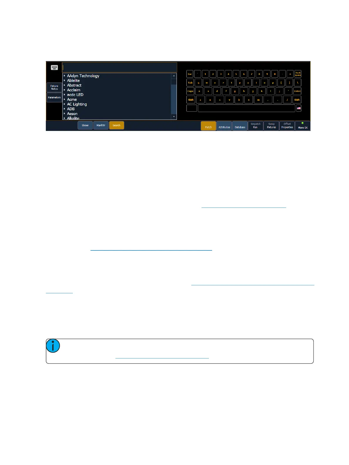 In the search window, press {Parameters} to view a parameter list for a fixture, or press {Fixture