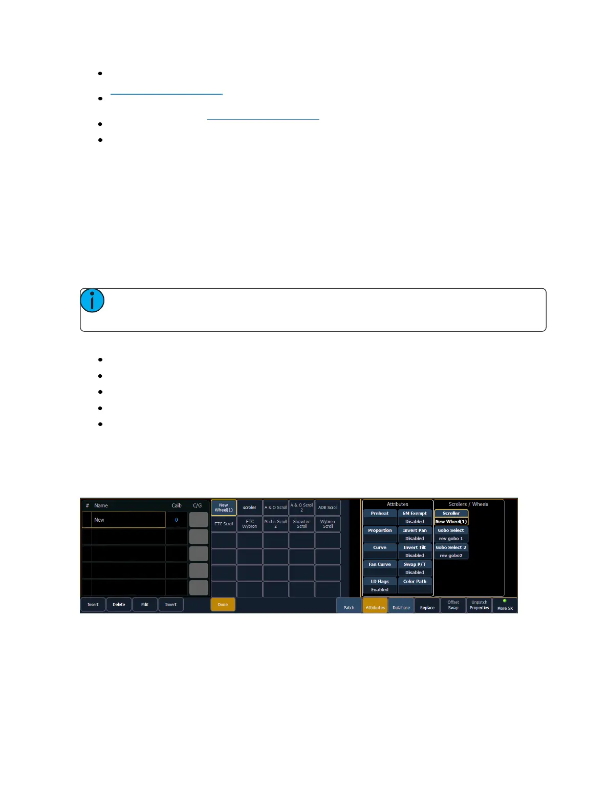 {New} - creates a new scroll or wheel and provides additional softkeys to enable the Editor. See