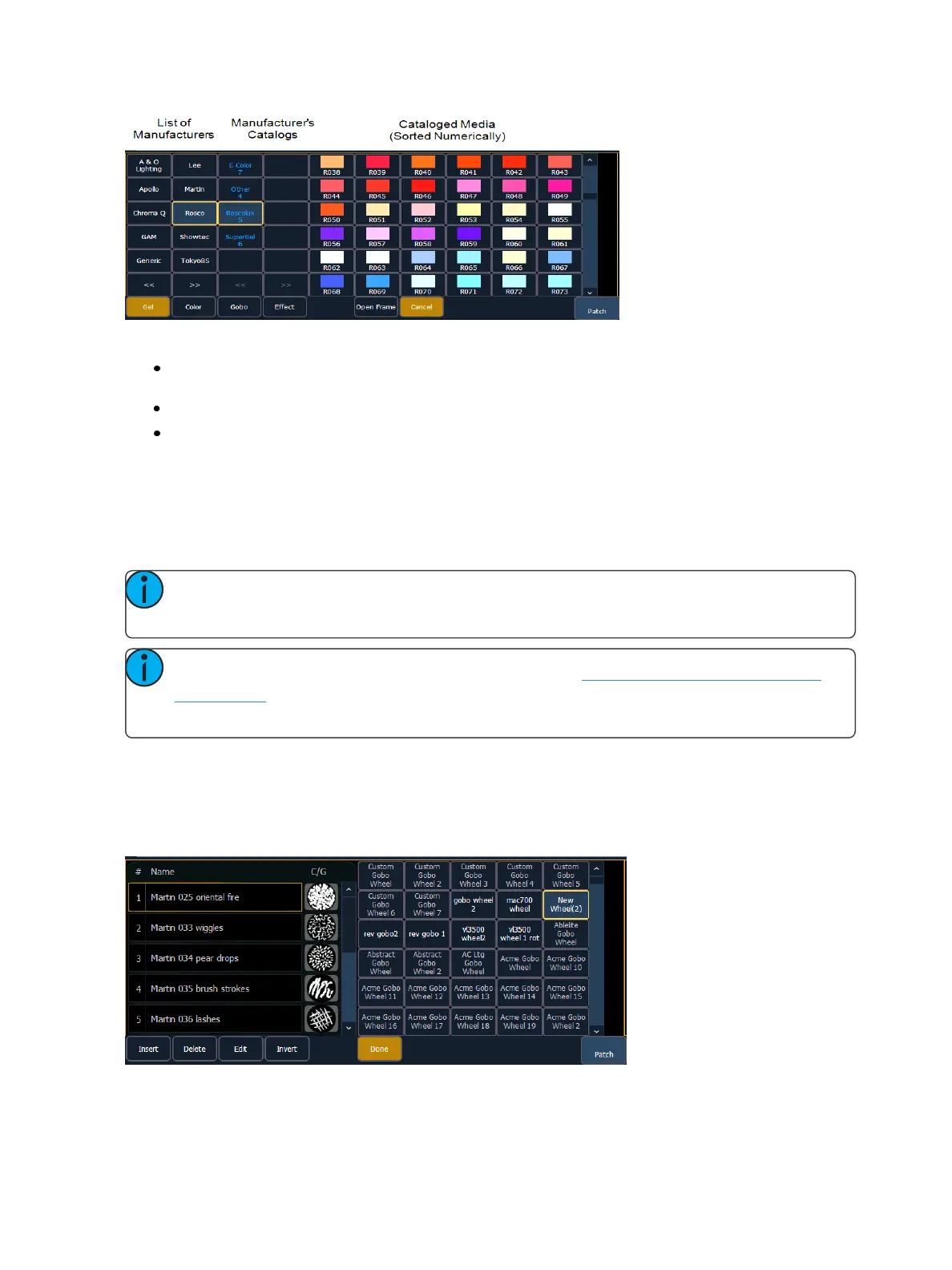 {Gel}, {Color}, {Gobo}, and {Effect} - each will display available media selections as they are cata-