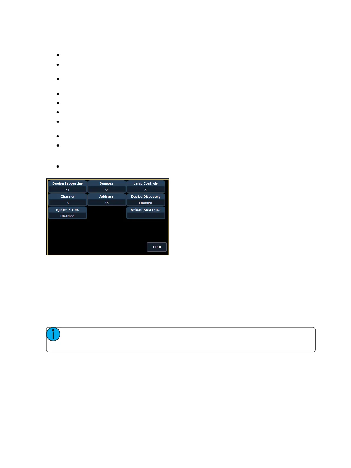 {Flash} - triggers the identify function of the RDM device. The identify function may defer