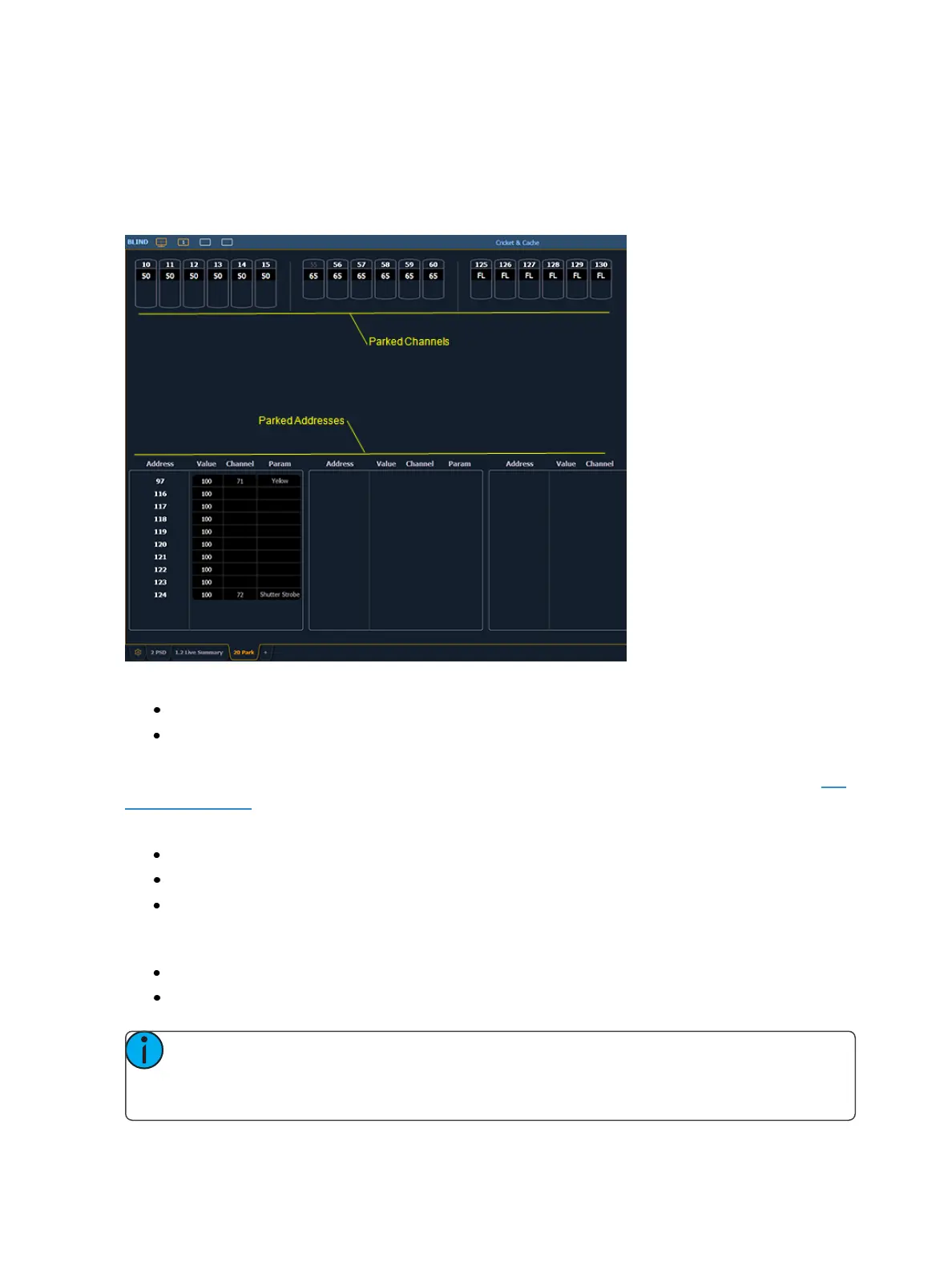 Following are examples for parking channel parameters from the park display:
