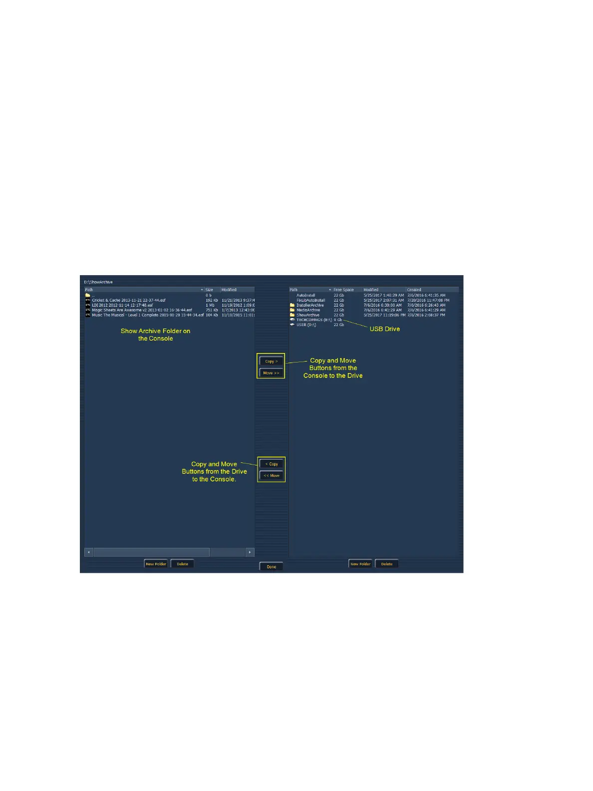 The file manager display will show the ShowArchive folder on your desk as well as any external USB