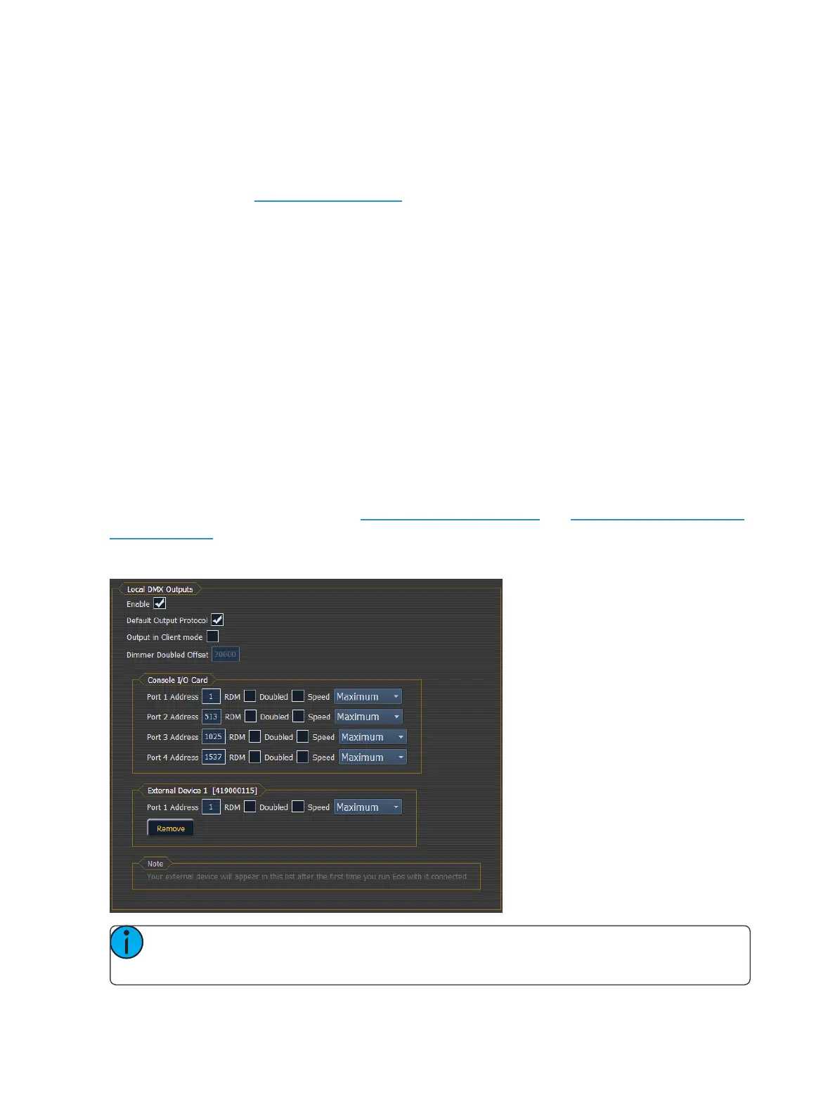This screen allows you to configure the Local DMX Outputs (below) and Show Control Outputs (on