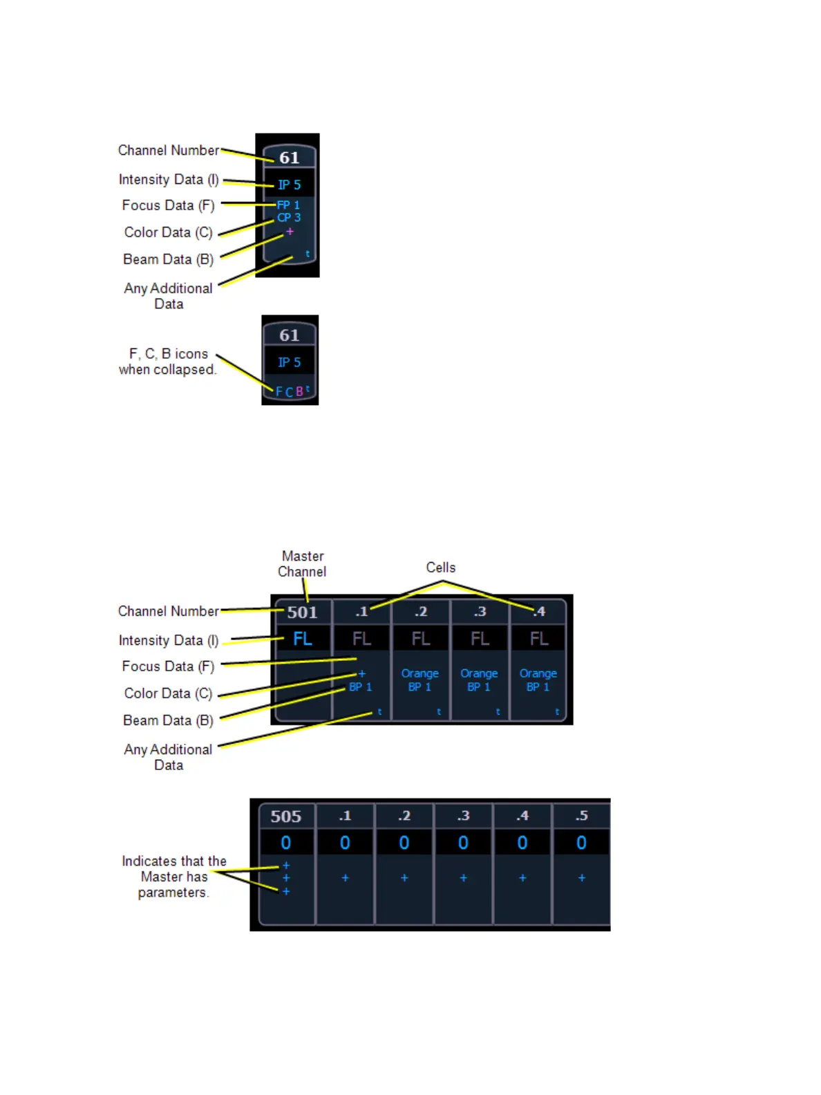 This view also has additional data fields beneath intensity (F, C, B). This information can be sup-