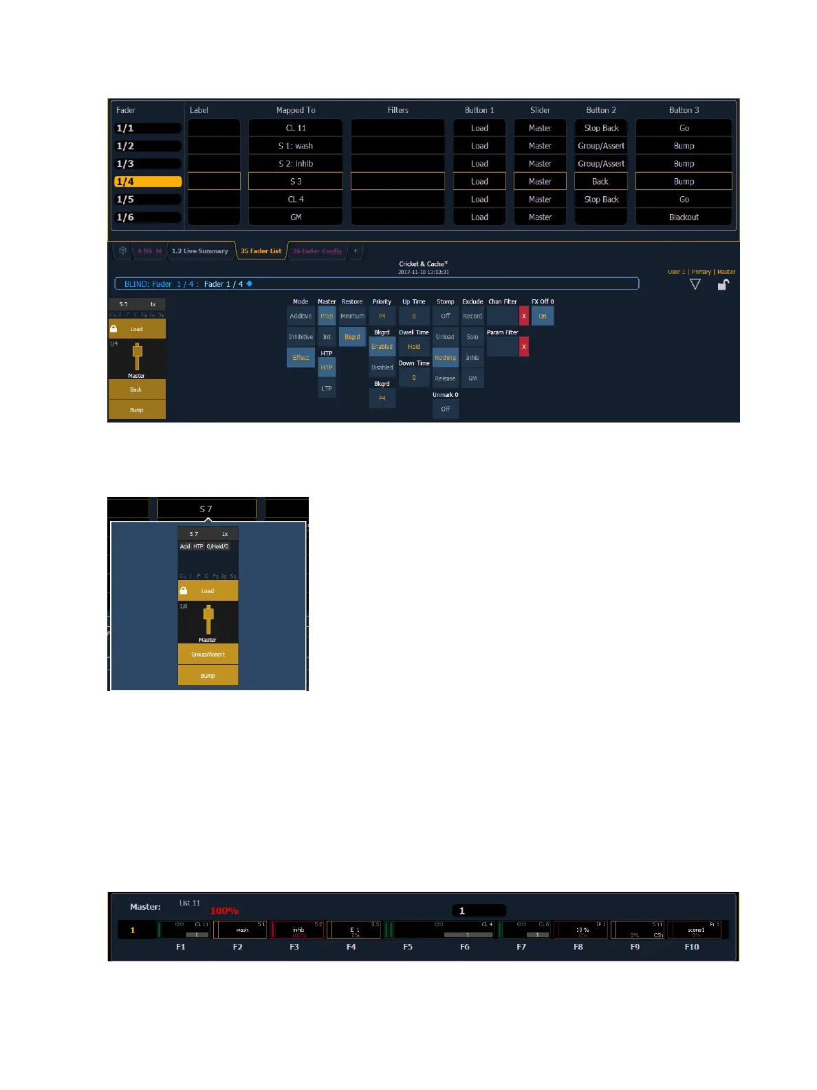 Grandmasters and inhibitive submasters are in red, additive submasters are yellow ,playback faders