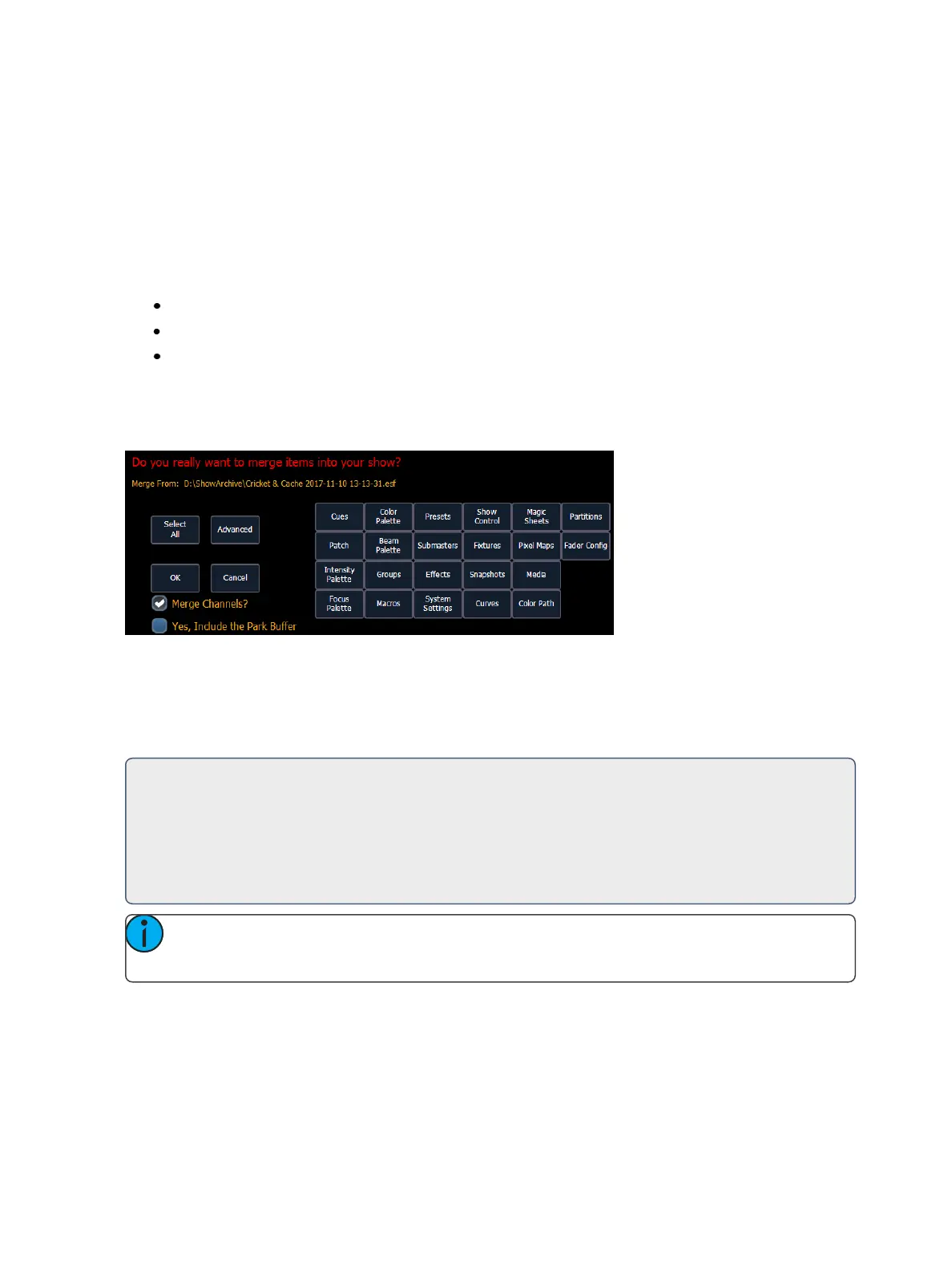 Note: It is important to remember that if the same channels exist in both show files, the