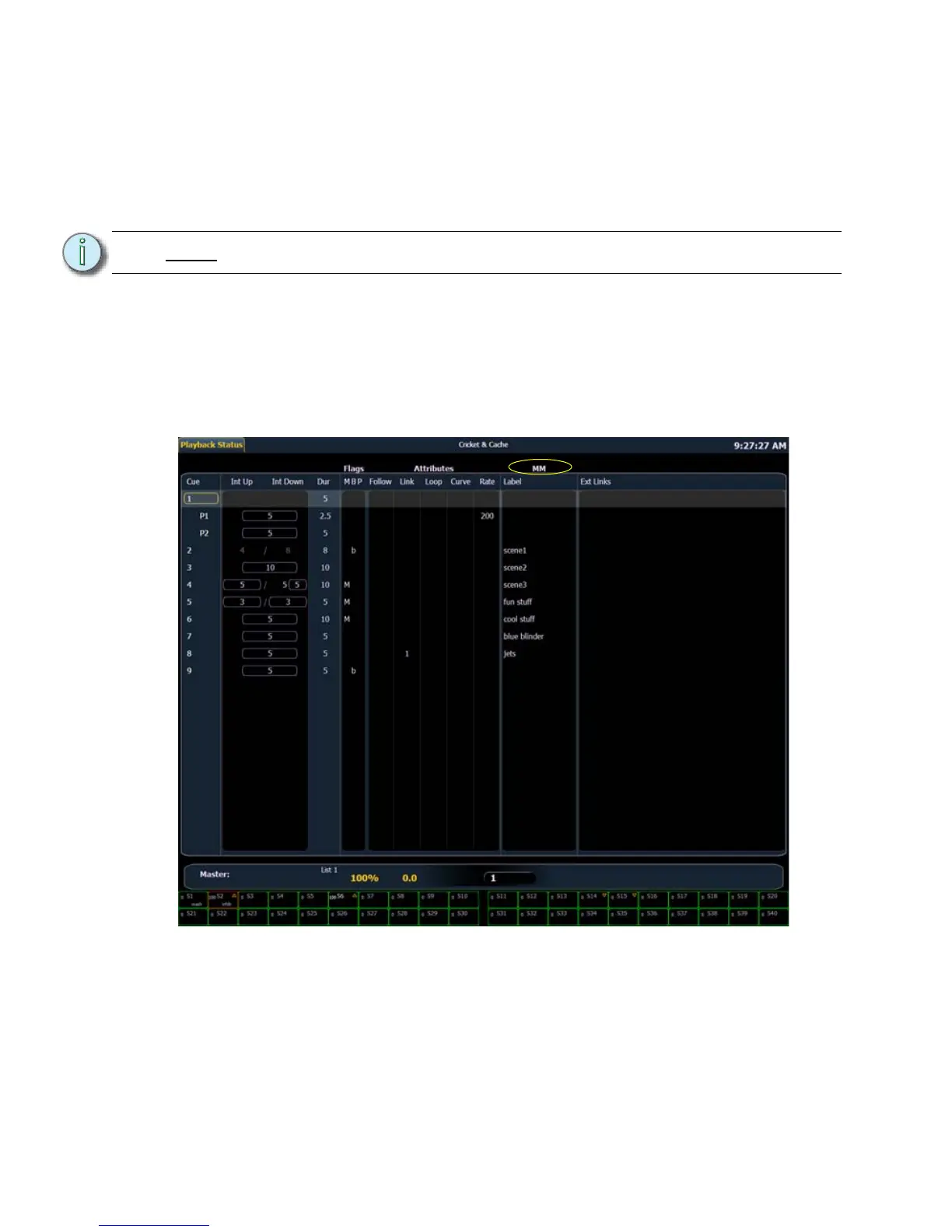 When manual master has been selected as the fader mode for a cue list, the initials ‘MM’ will