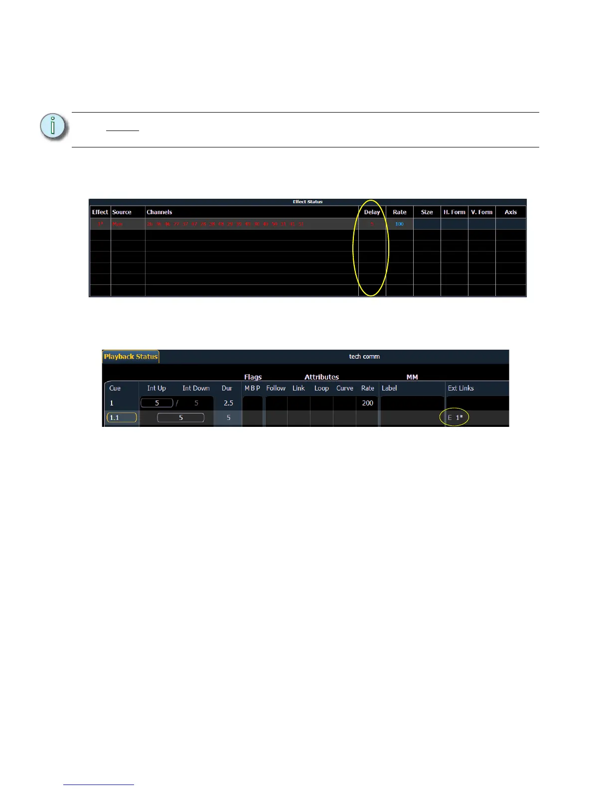 A delay can be placed on an effect in a cue or submaster in the Effect Status display by using the