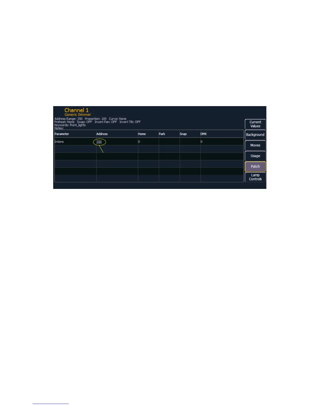 • List of all parameter values with their address, home value, snap parameter, DMX