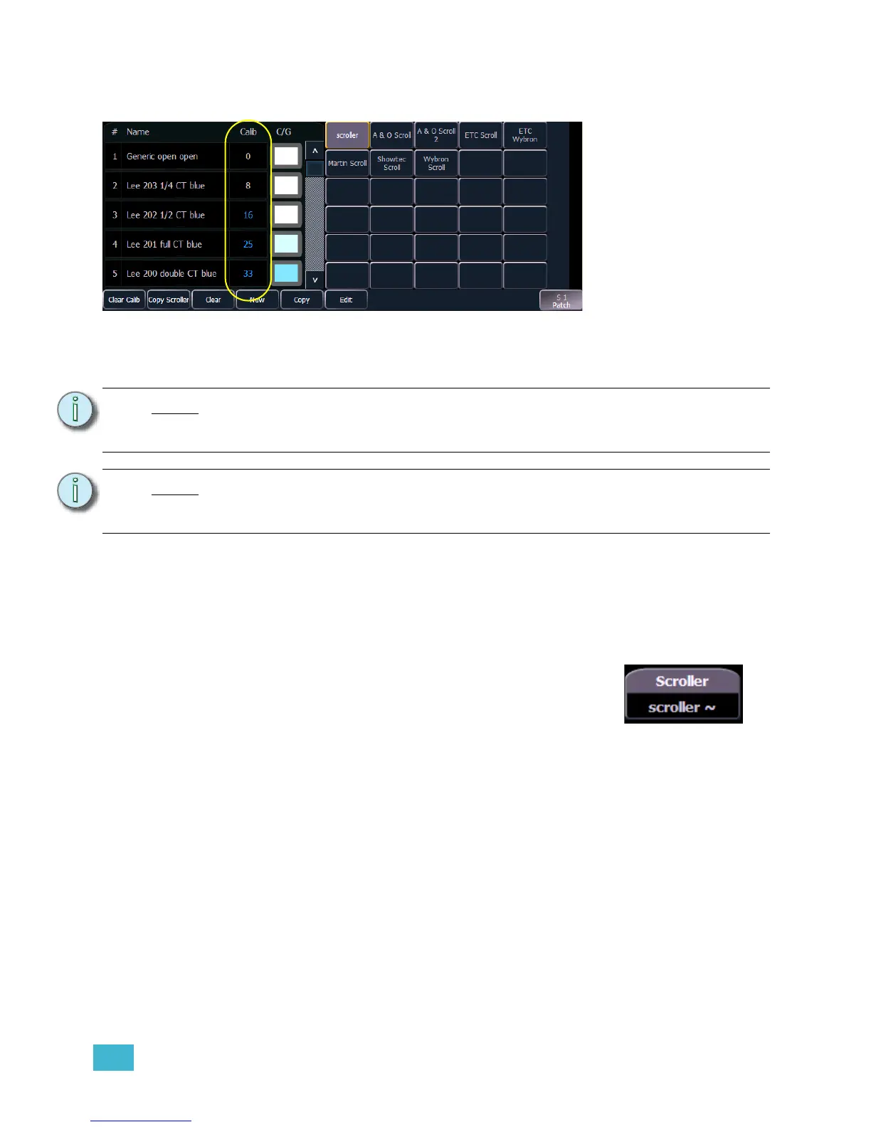 • [1] {Copy Scroller} [2] [Enter] - copies the scroller and calibration data from channel 1 to