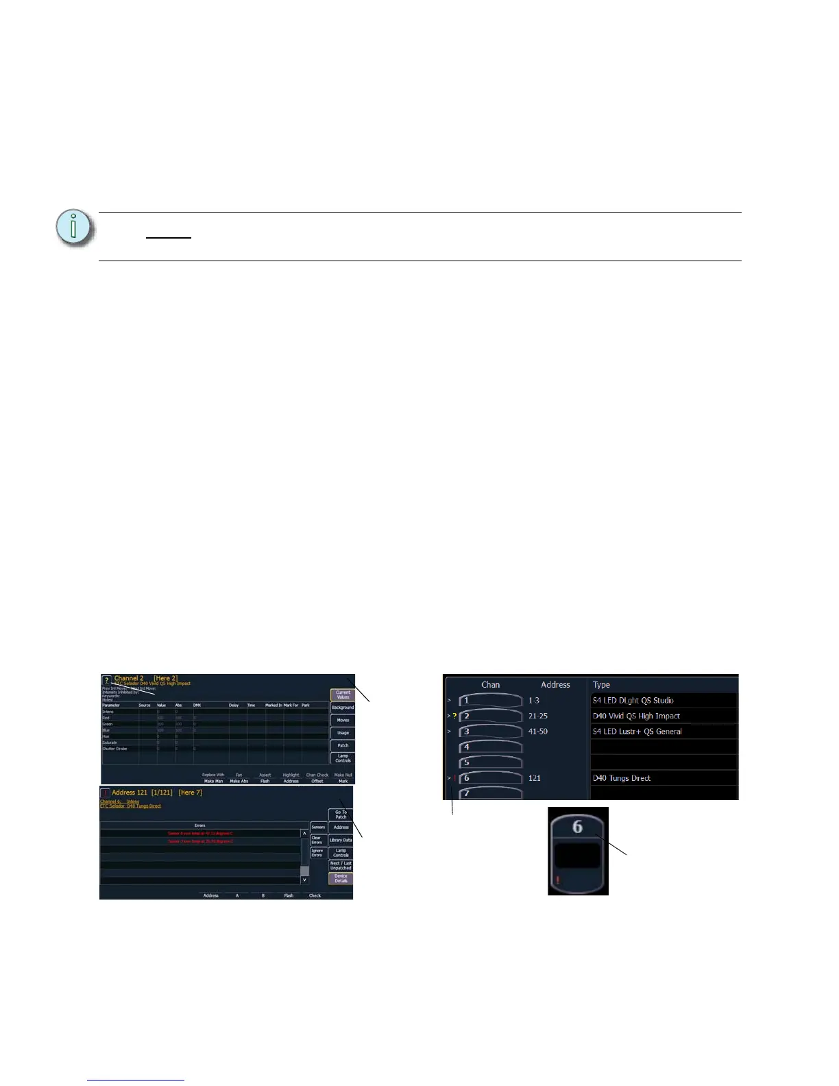 • The desk warns you when a channel’s attached dimmer has an error or is offline.
