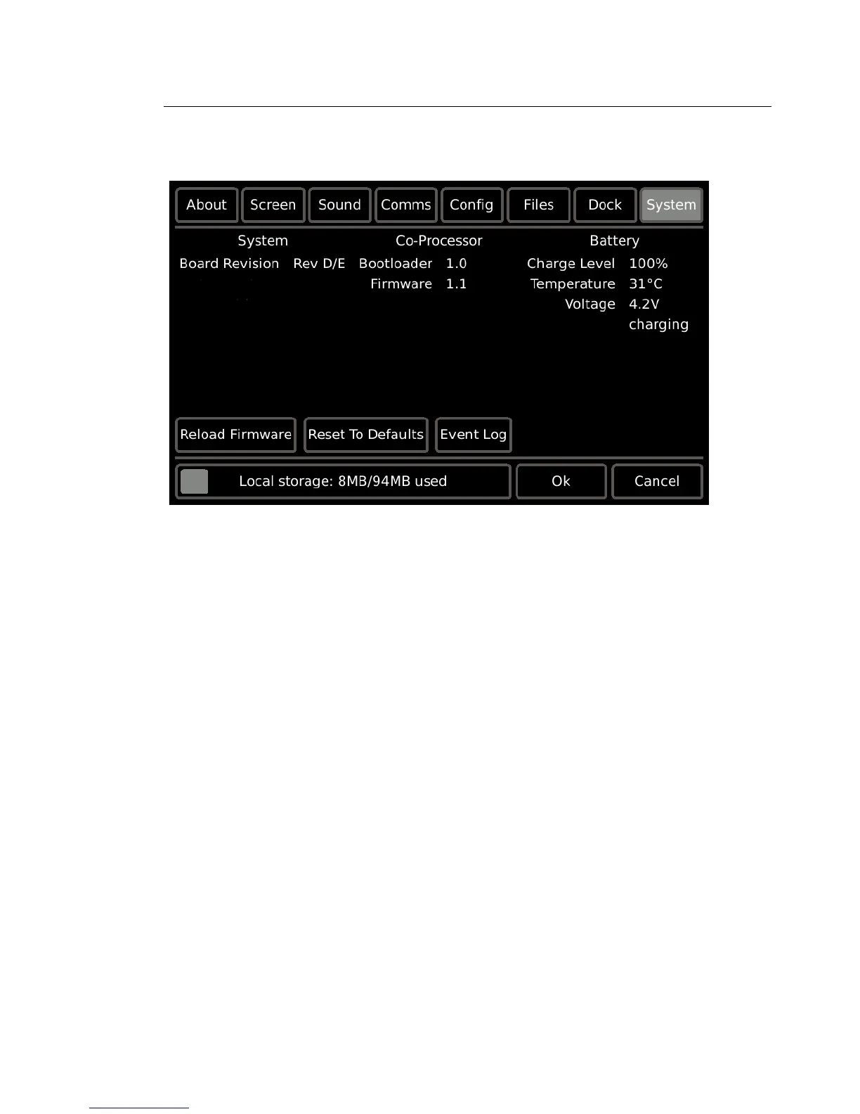 includes the ability to Reload Firmware, Reset to Defaults, and view the Event Log.
