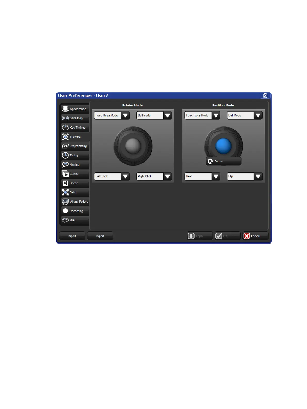 The Track Ball pane of the User Preferences window