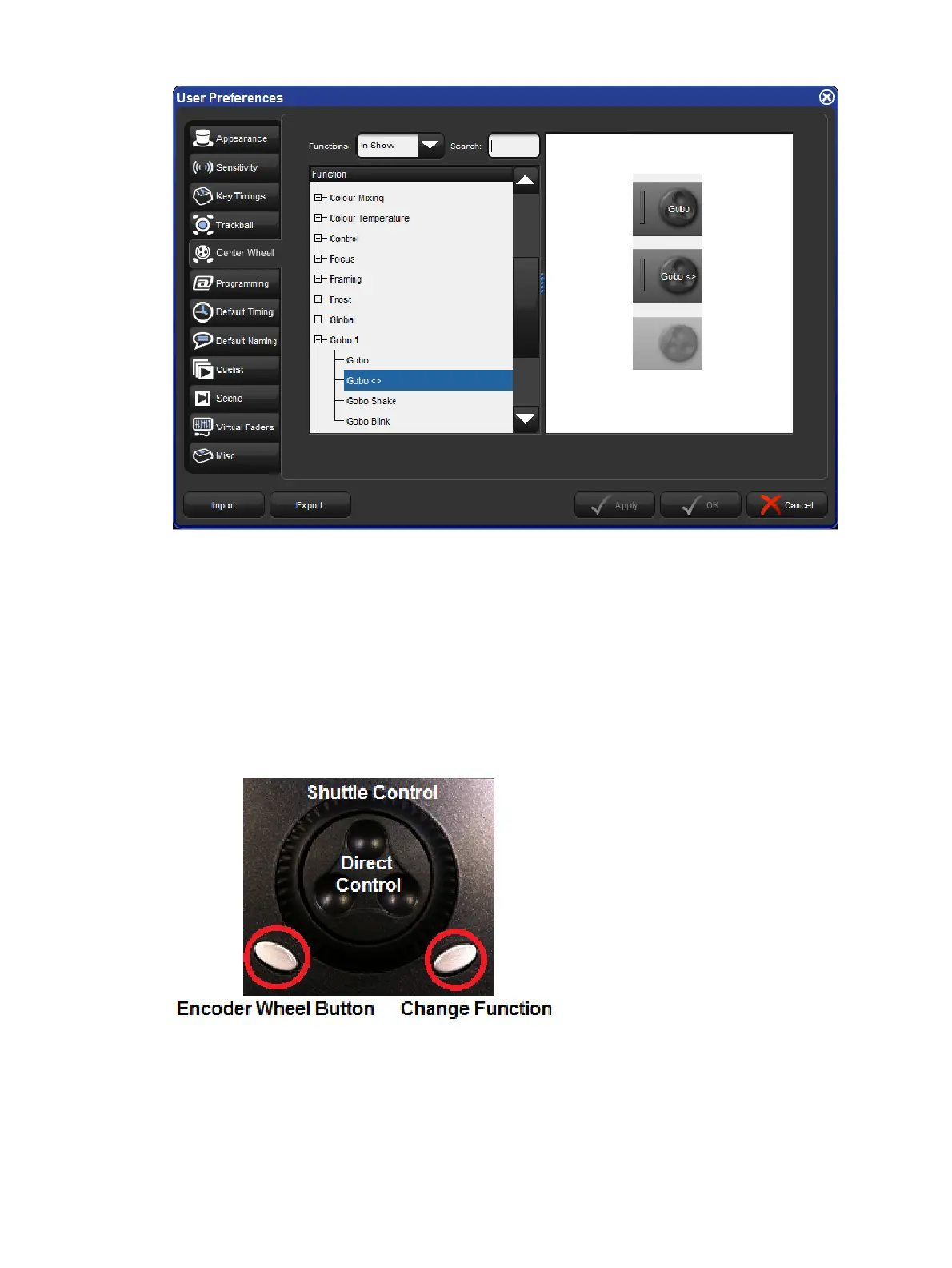 When a fixture selection is made functions assigned to the center wheel will be displayed on