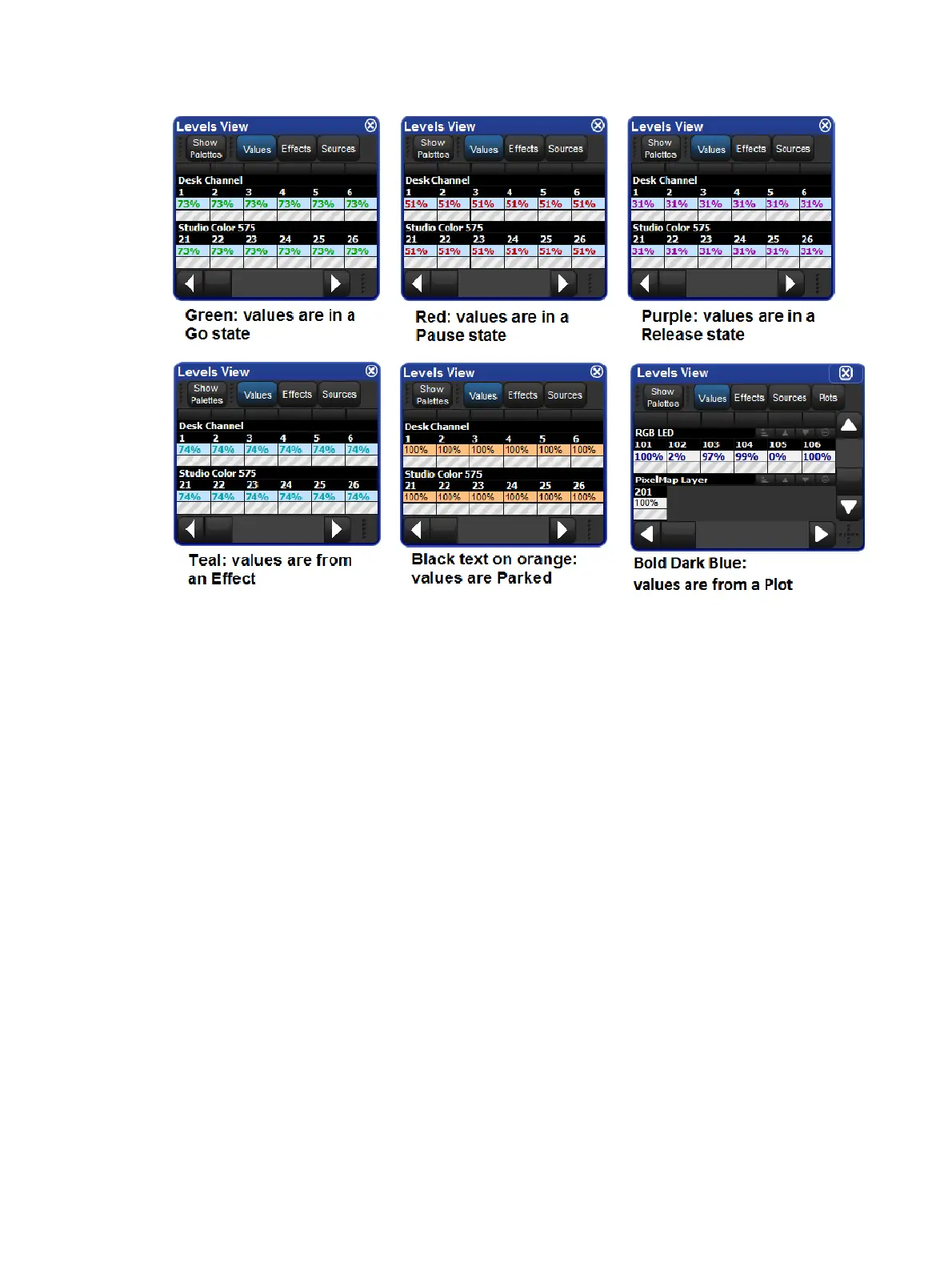 Cross-fading values will appear in the Levels View window in the following colours: