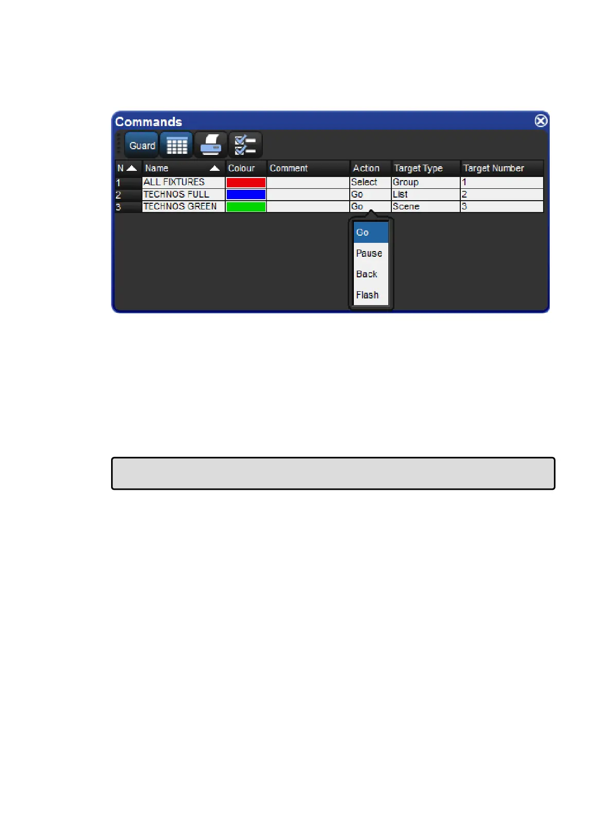 For Command Keys linked to Lists and Scenes: The available actions include "Go",