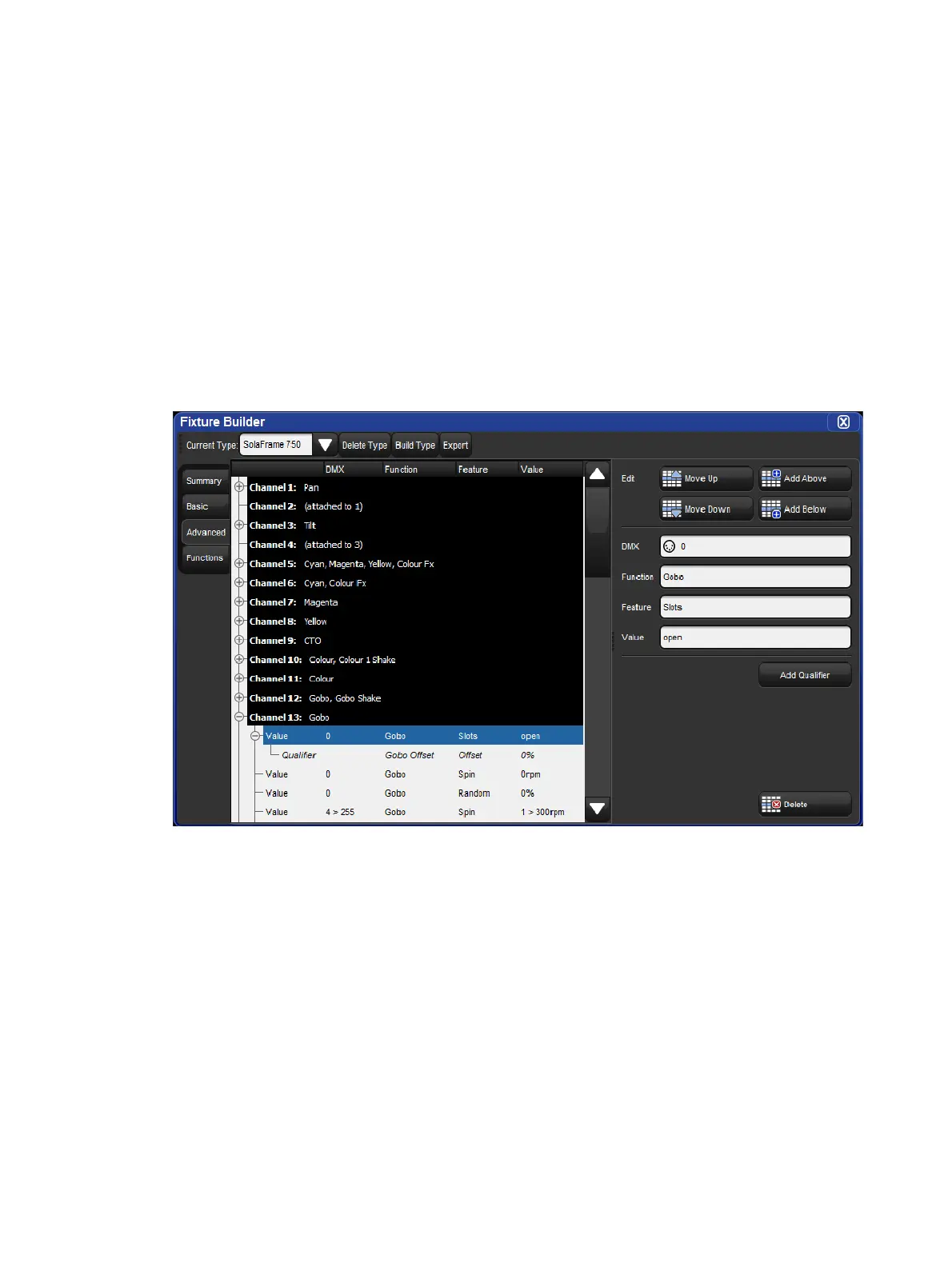 a fixture type's DMX channel structure and allows for advanced editing of each DMX channel.