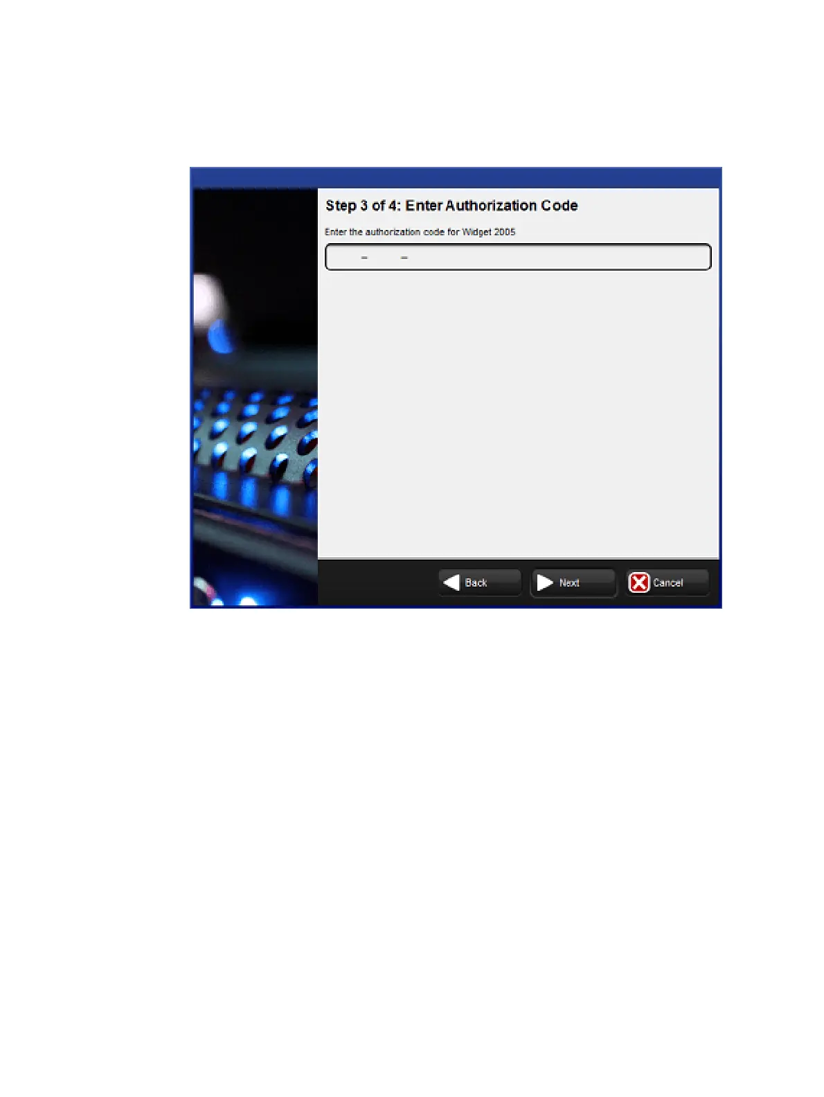 5. Enter the authorization code for the selected widget and press Ne xt (the authorization