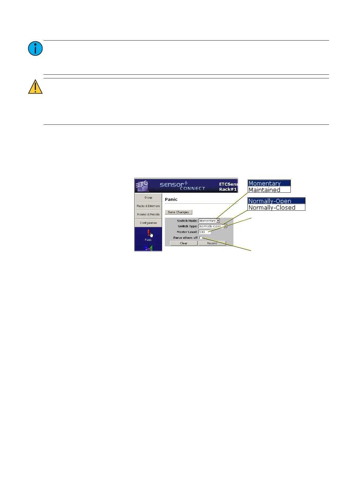 This is the page where you configure Panic for switch mode and type as well as record or clear the