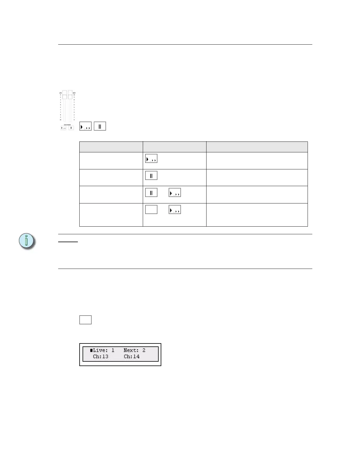 The Crossfader consists of a Live (A) and Next (B) fader, plus the Crossfade transport