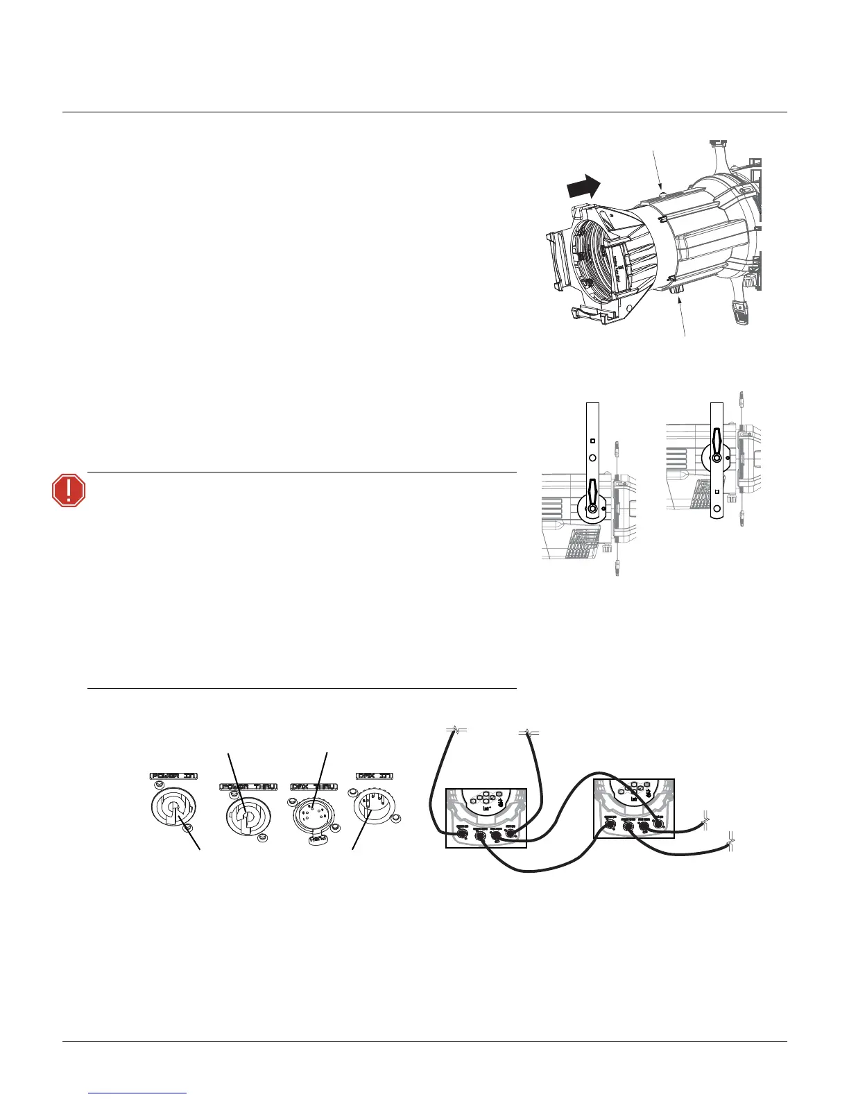 4: Link additional fixtures via the Power Thru and DMX Thru connectors using the following guidelines.