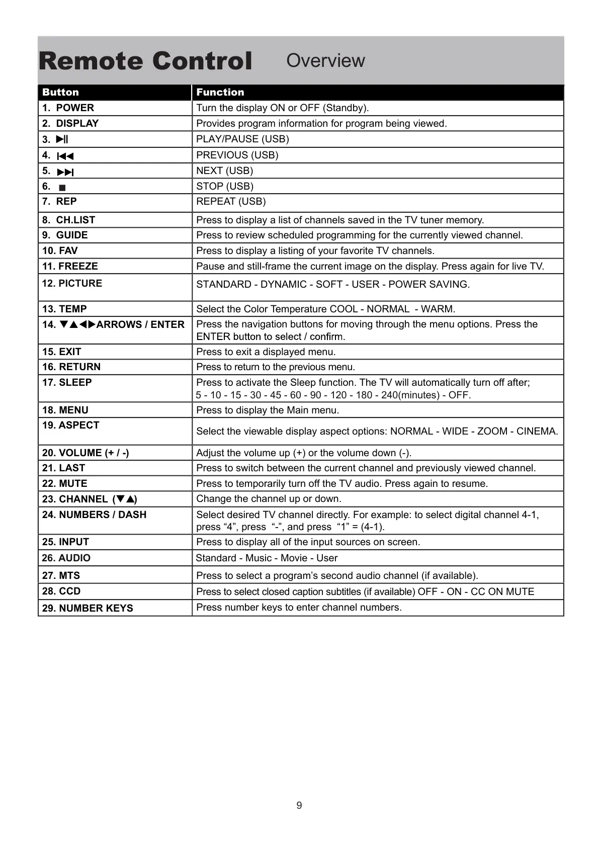 17. SLEEP Press to activate the Sleep function. The TV will automatically turn off after;