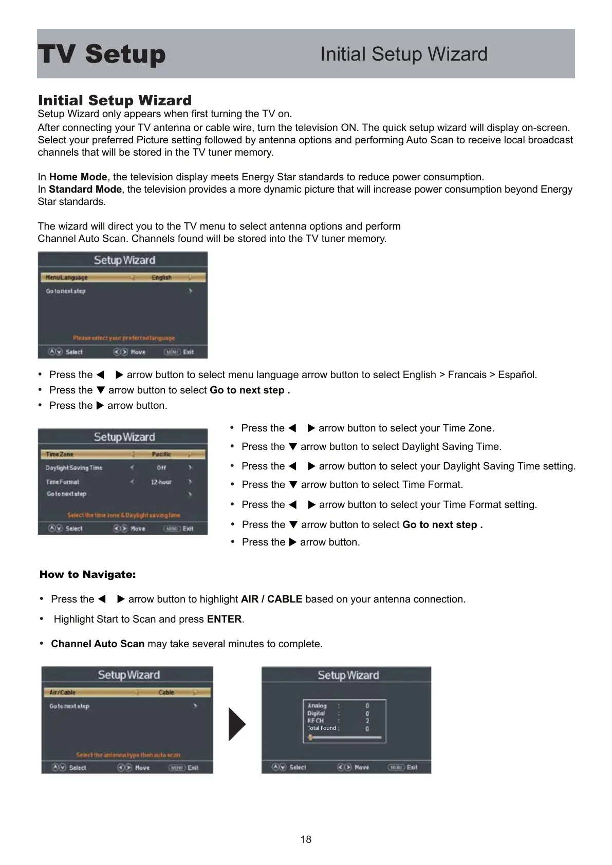 The wizard will direct you to the TV menu to select antenna options and perform