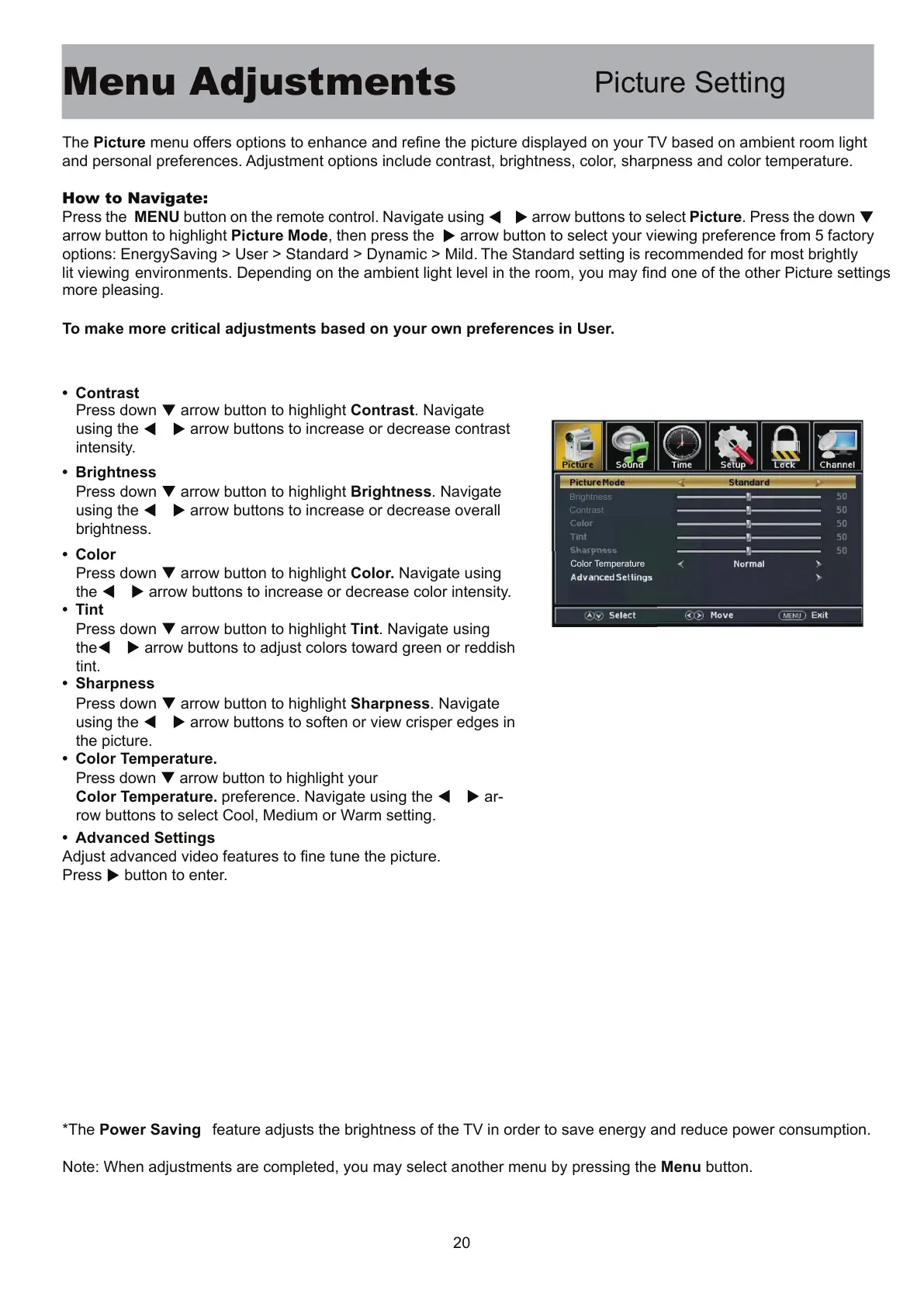The Picture menu offers options to enhance and refine the picture displayed on your TV based on ambient room light