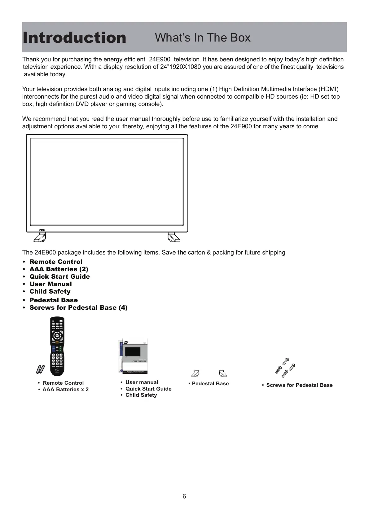 Thank you for purchasing the energy efficient 24E900 television. It has been designed to enjoy today’s high definition