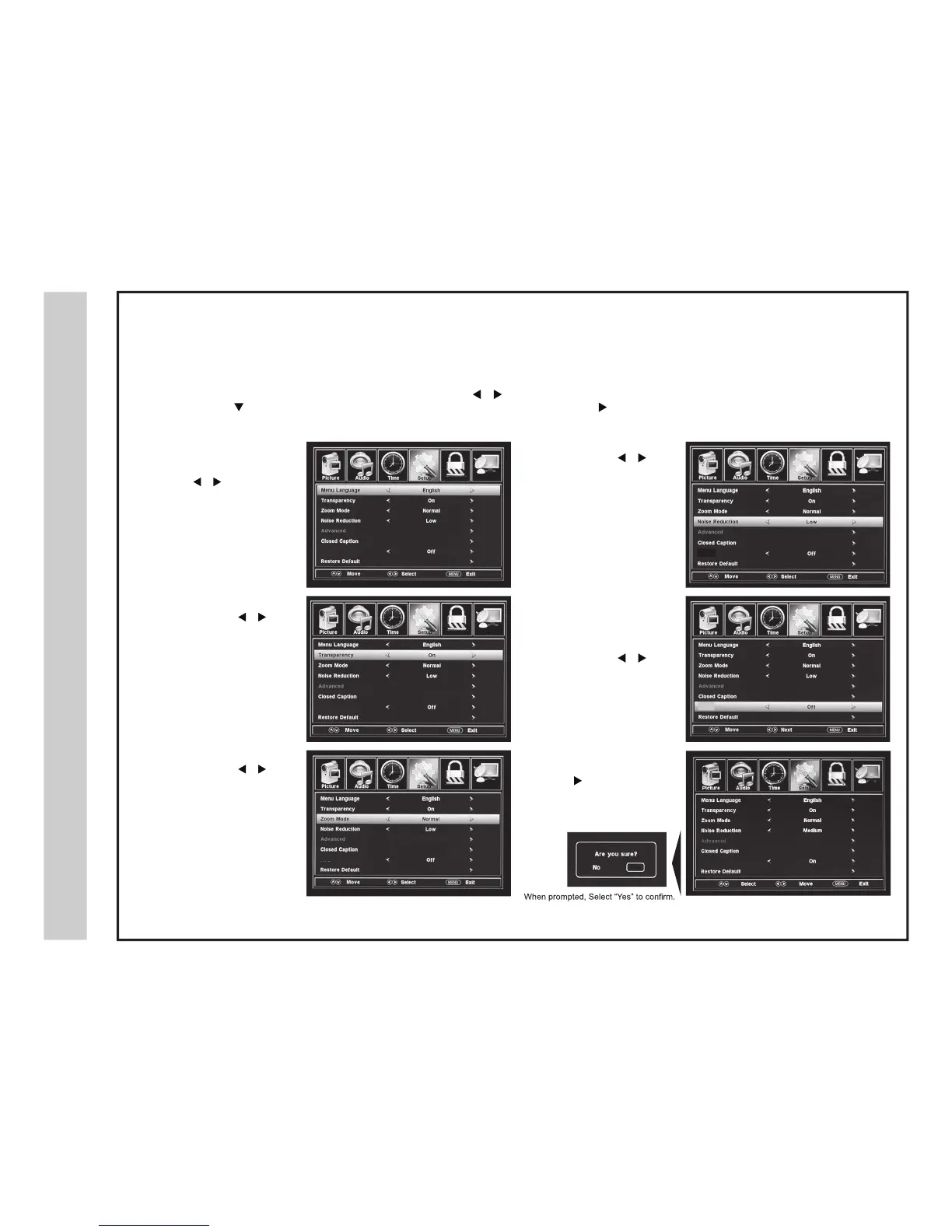 closed captions, enhancement of contrast details in the picture and resetting your TV back to its factory default settings.