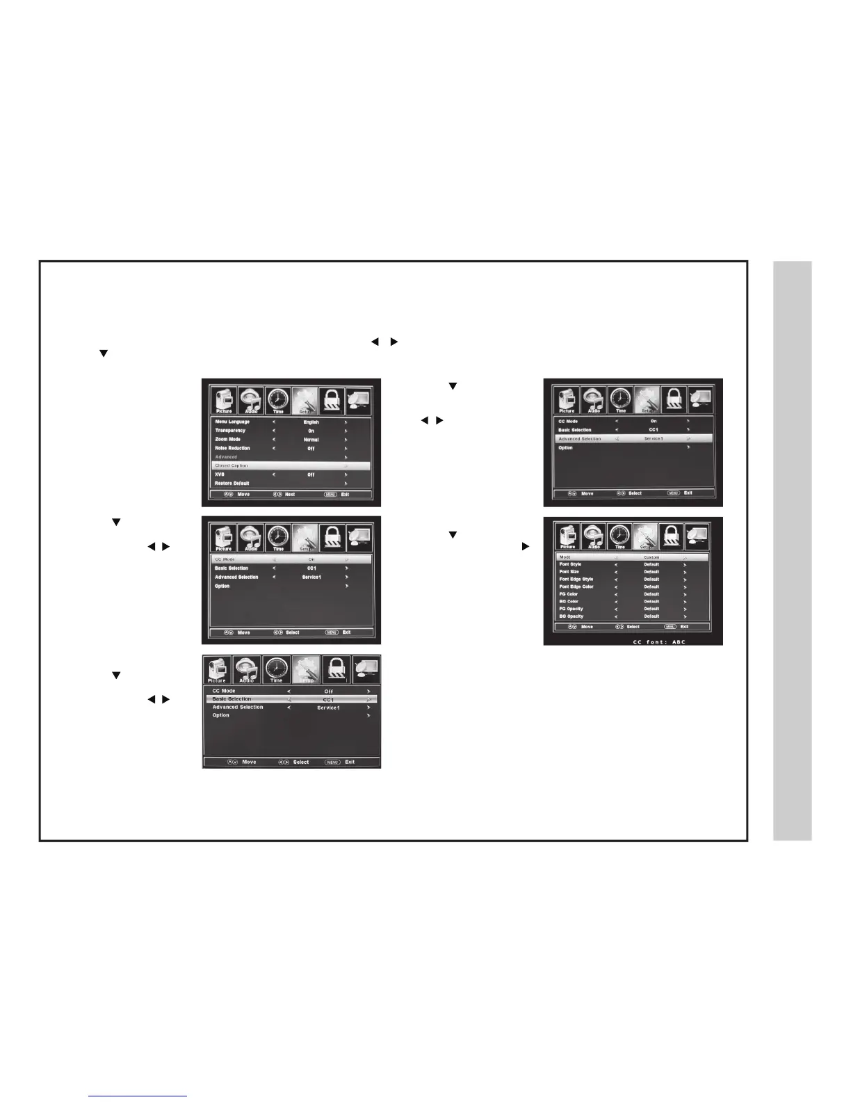 The SETUP menu includes adjustments for activating the Closed Caption (CC) feature for display on the television and customization of the CC display