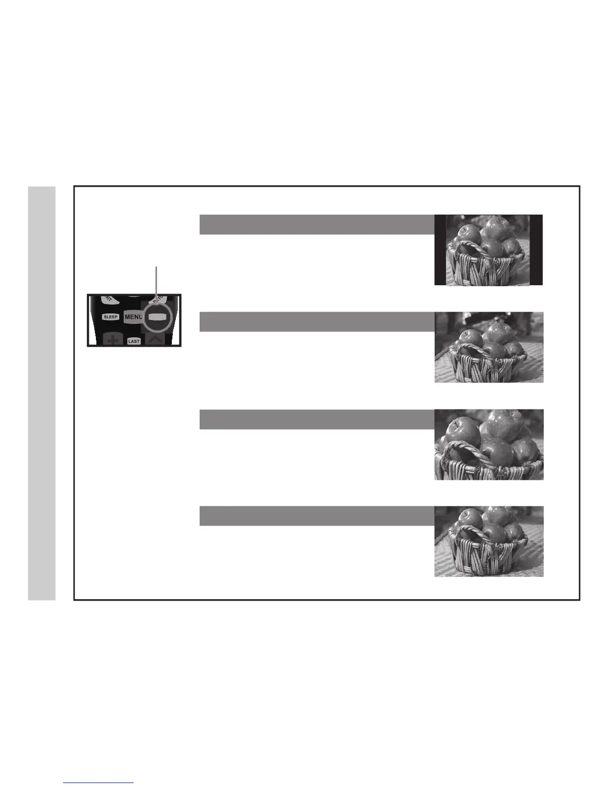 The ASPECT function offers several viewing display options on the 16:9 screen. Press the ASPECT button to cycle through the following