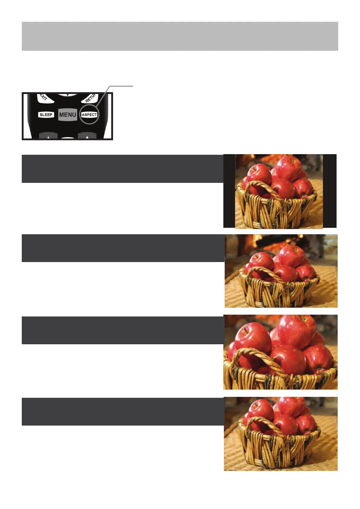 The ASPECT function offers several viewing display options on the 16:9 screen. Press the ASPECT button to cycle