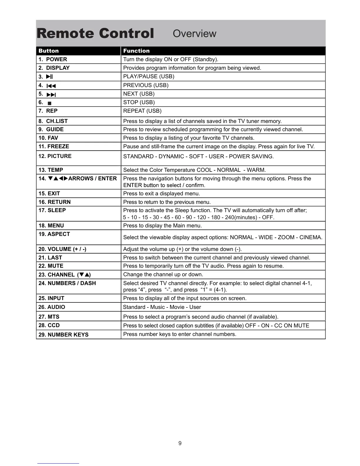 17. SLEEP Press to activate the Sleep function. The TV will automatically turn off after;