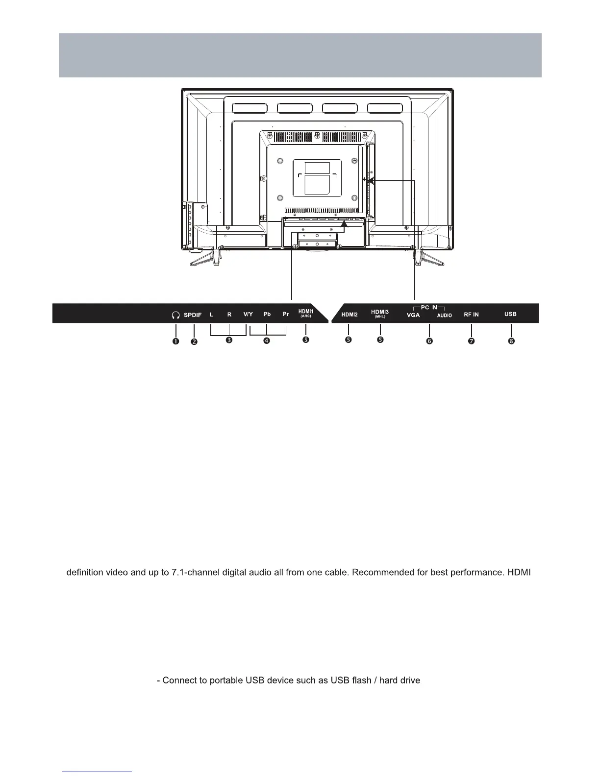 6. PC IN - VGA Input - Connect an optional VGA cable (not included) from your personal computer.