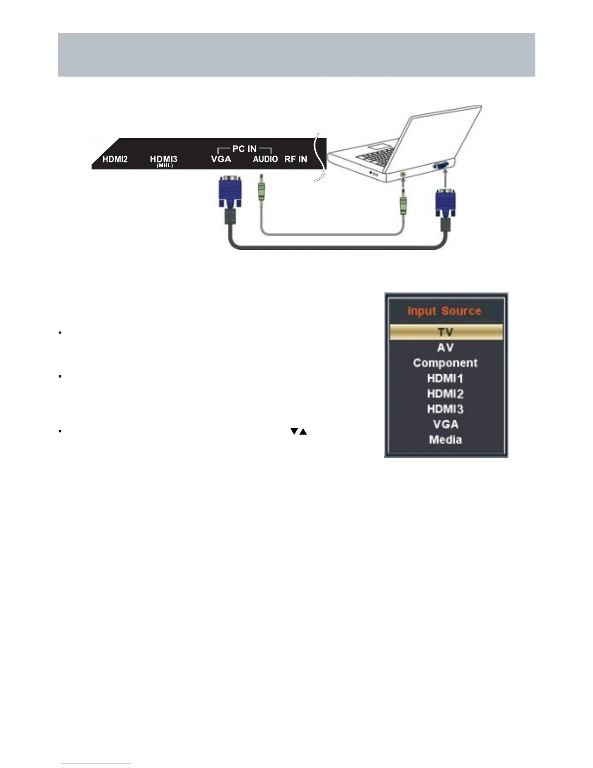 your PC to the VGA input on the TV’s panel.