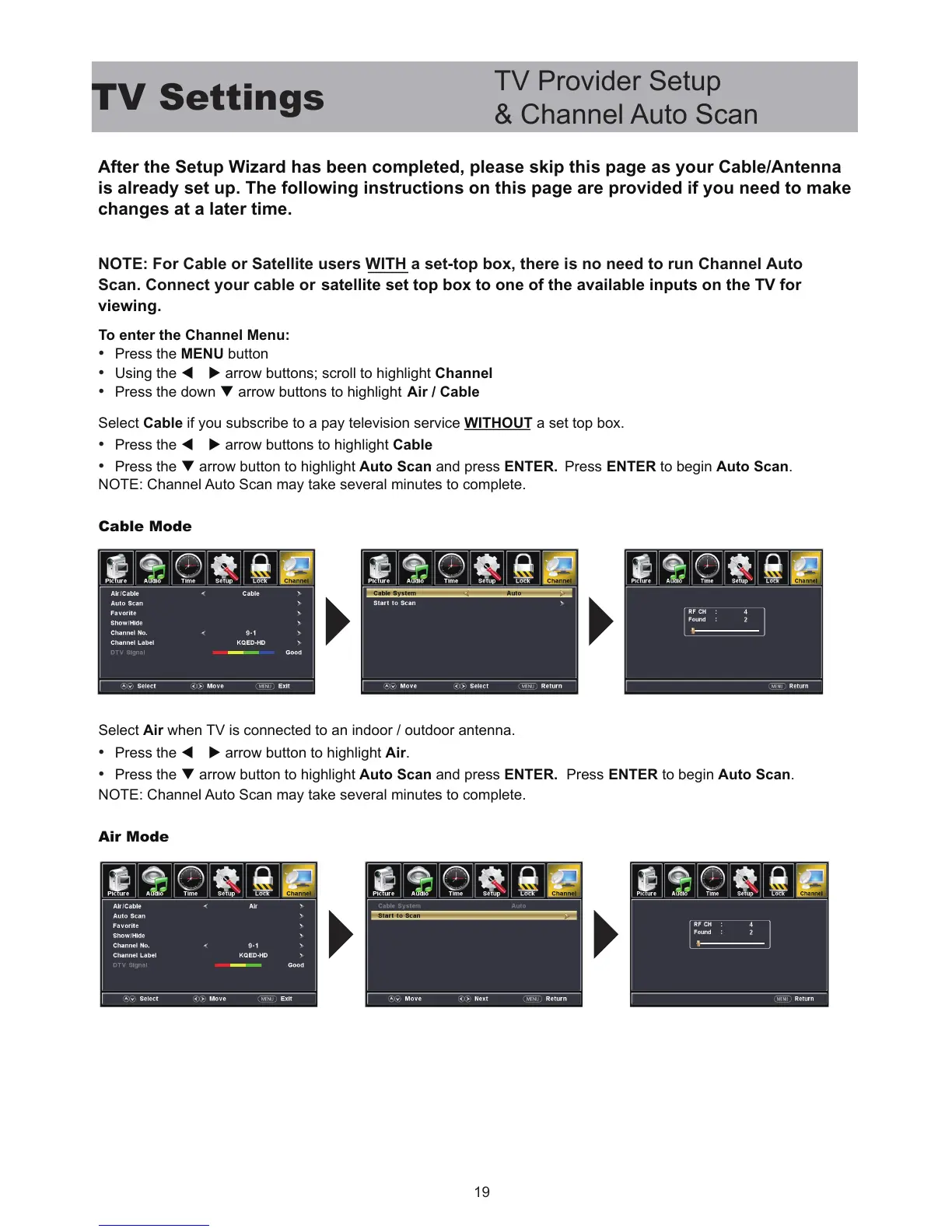 NOTE: For Cable or Satellite users WITH a set-top box, there is no need to run Channel Auto
