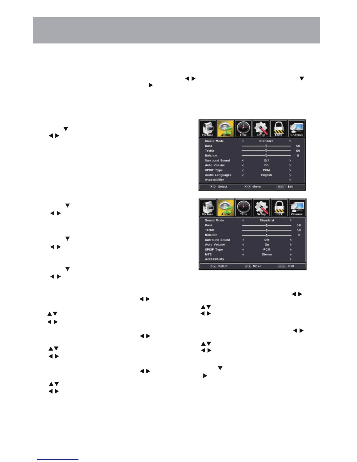 Press the MENU button on the remote control. Navigate using arrow buttons to select Sound. Press the arrow