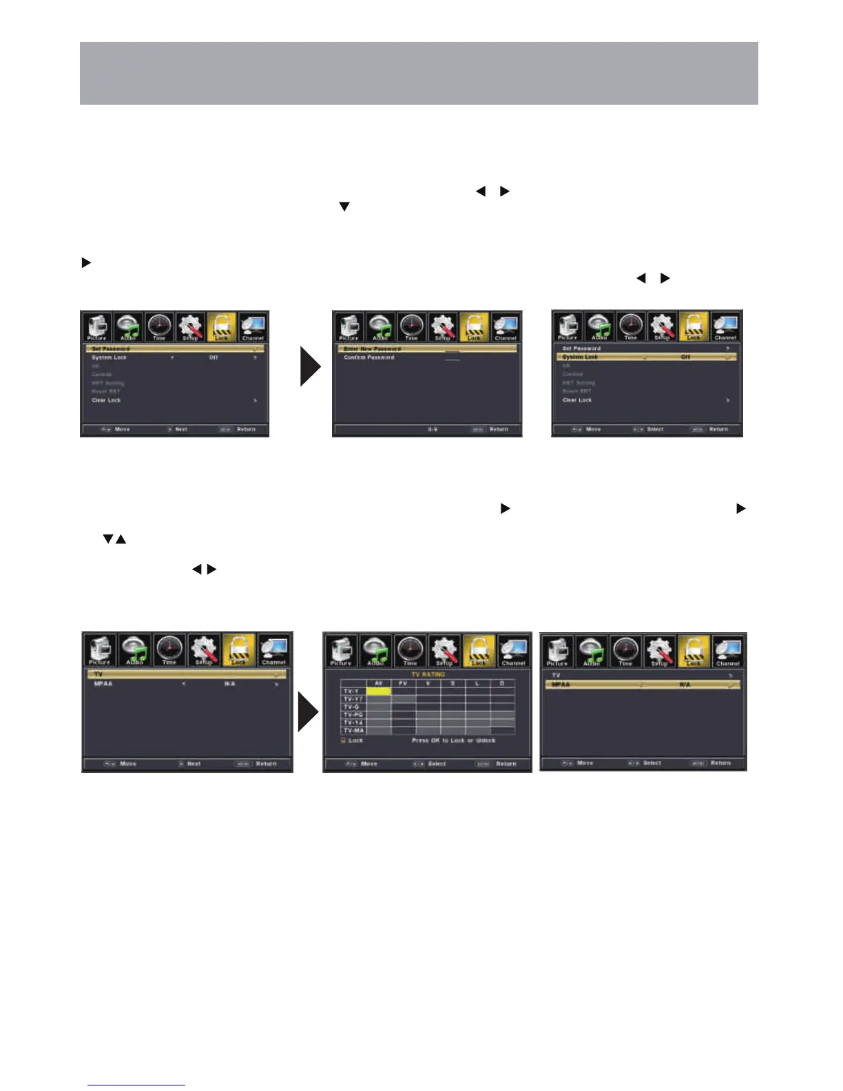 In the Lock menu, you may block television and movie programming based on TV ratings and Motion Picture Association
