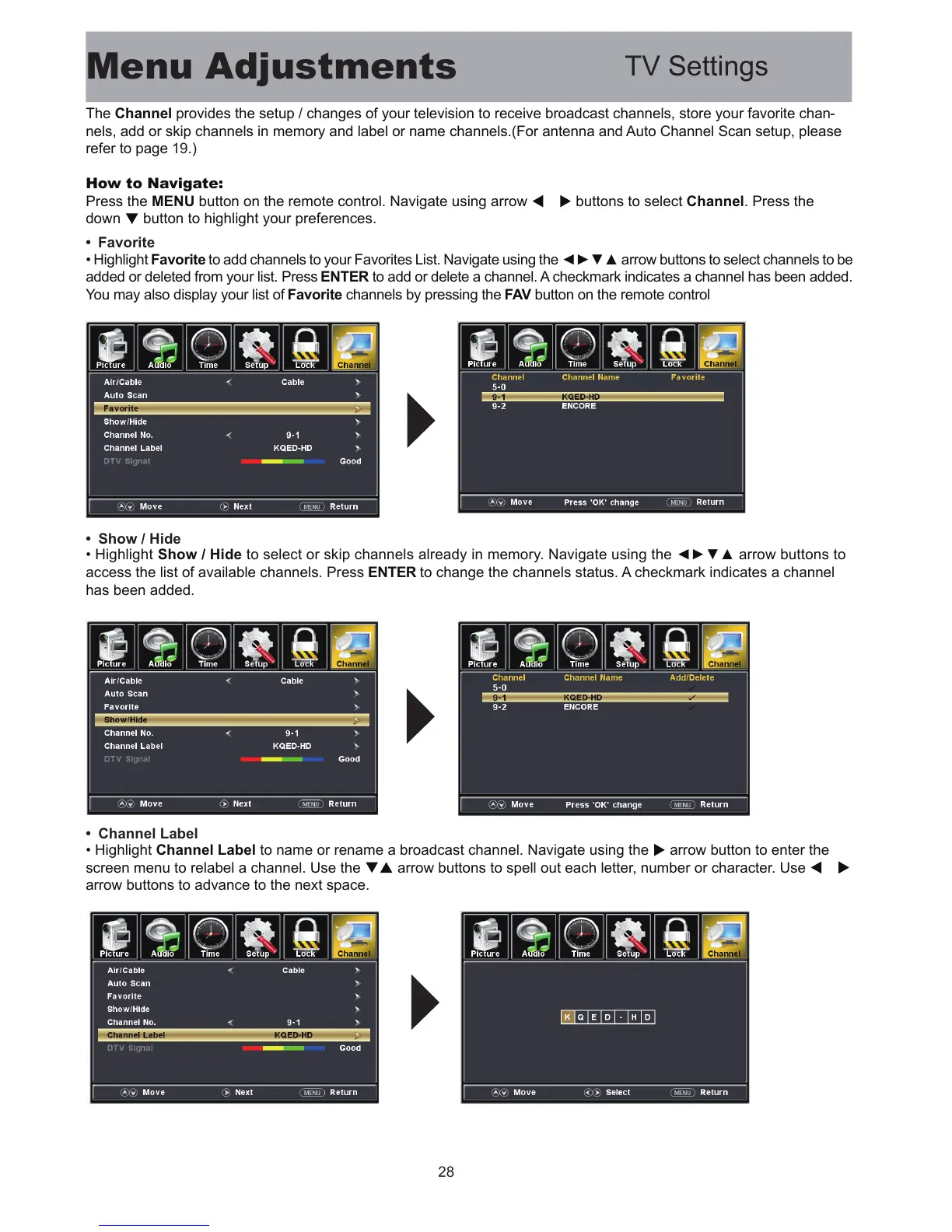 nels, add or skip channels in memory and label or name channels.(For antenna and Auto Channel Scan setup, please