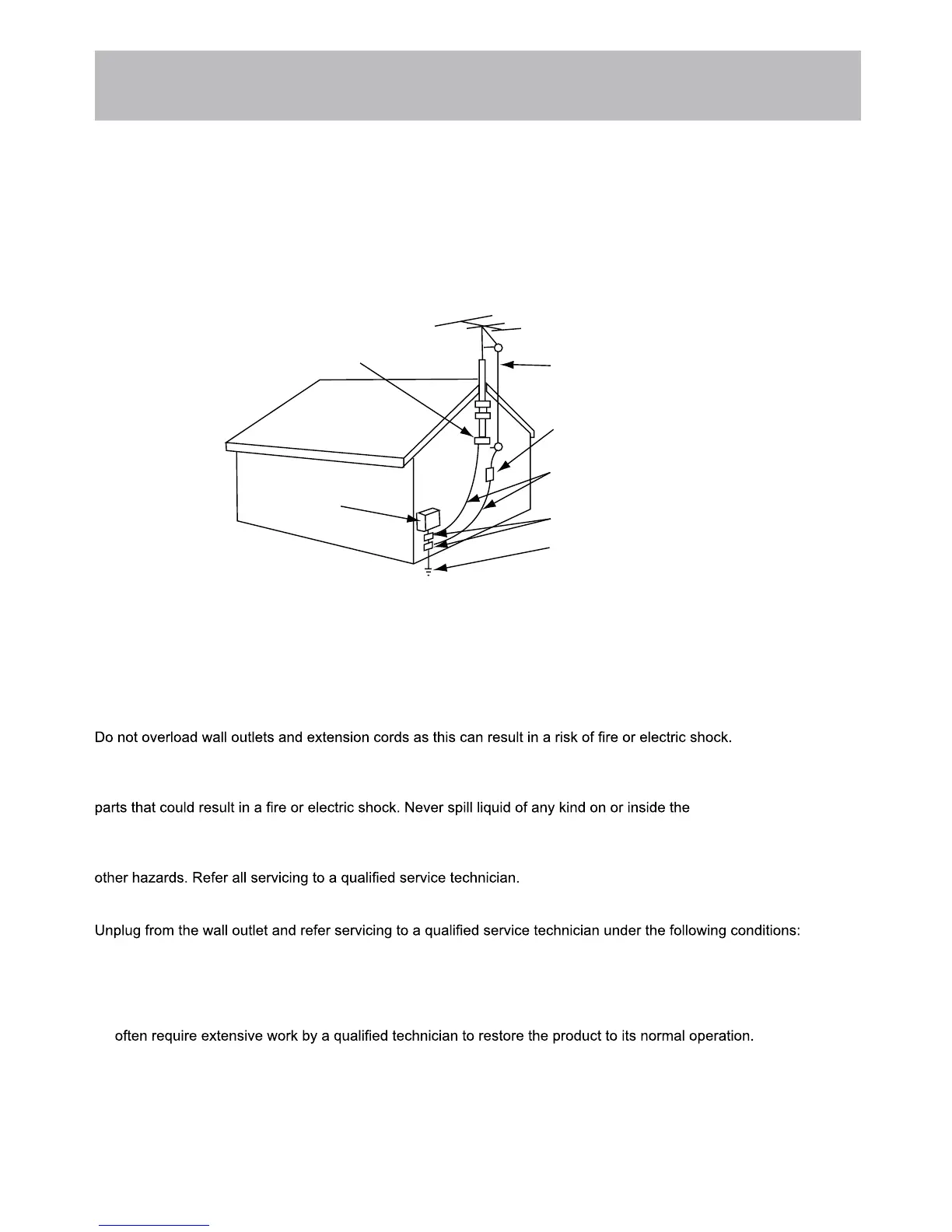 circuits, or where it can fall on to power lines or circuits. When installing an outside antenna system, extreme care